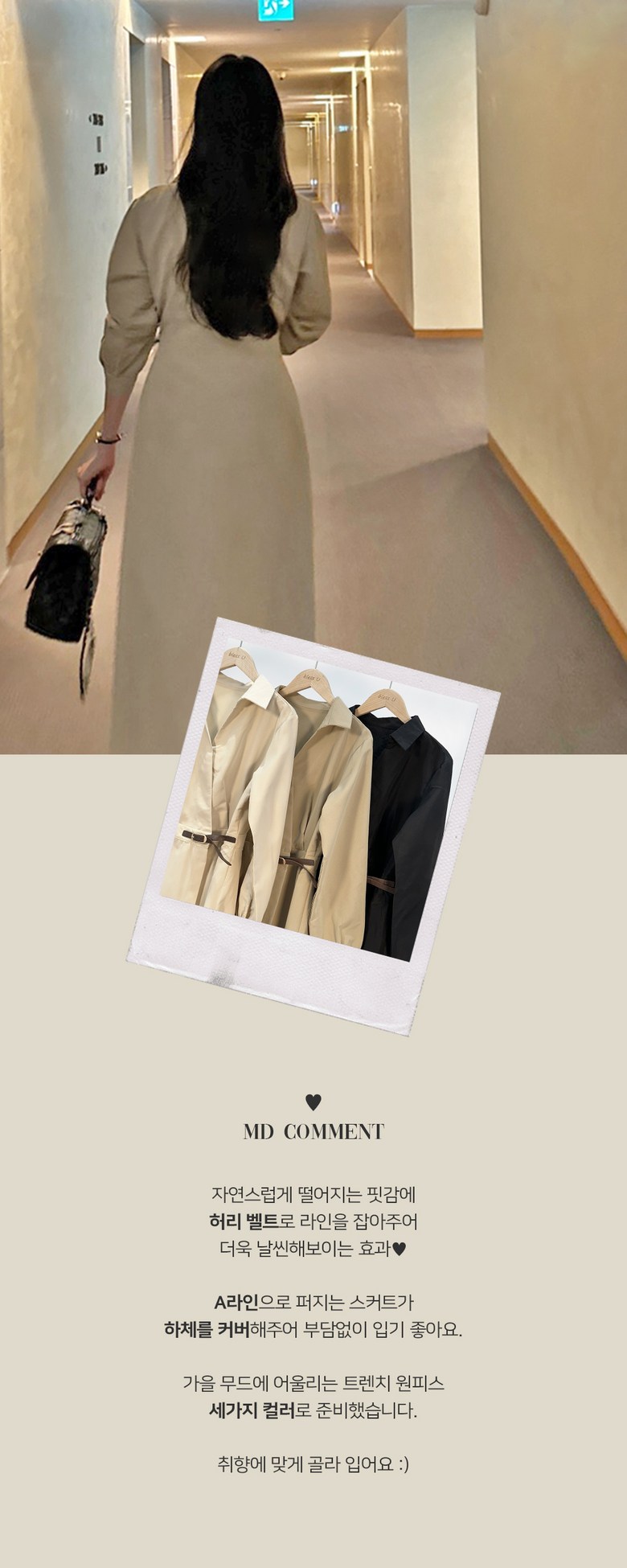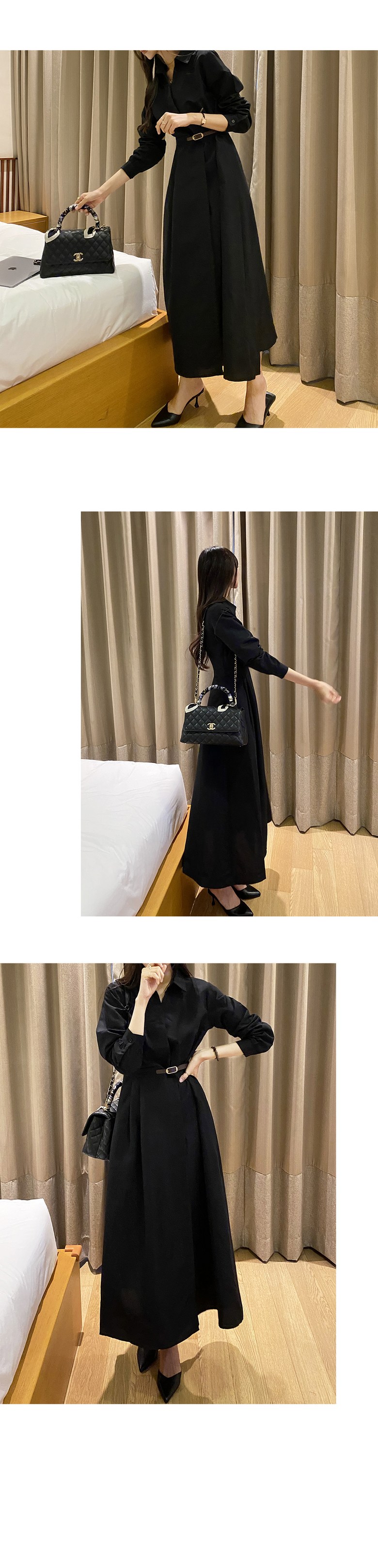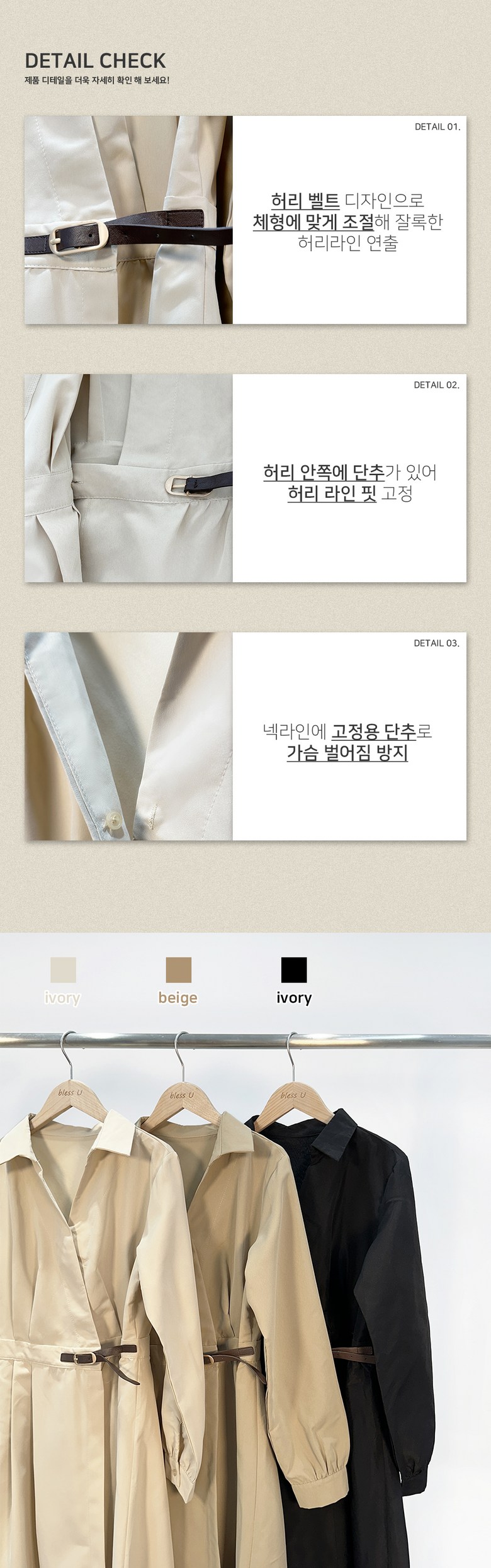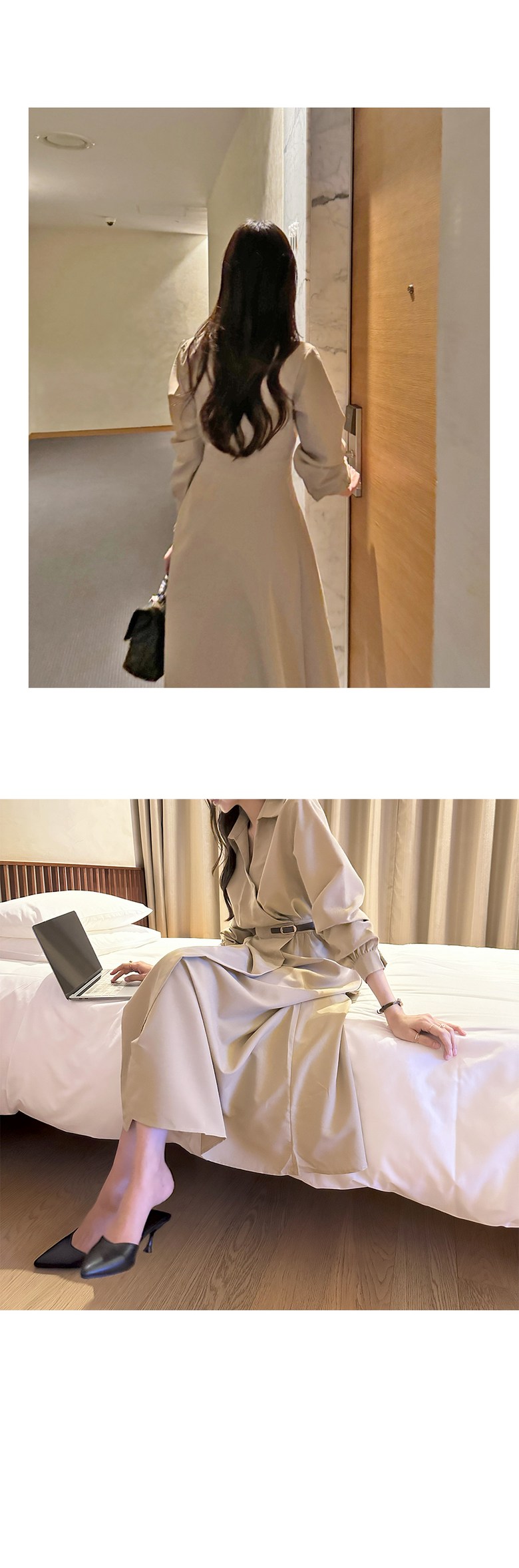 블레스유 여성 봄 가을 벨트 프렌치 카라 롱 핀턱 랩 원피스 하객룩 데이트룩 데일리룩 허리조절 긴팔 브이넥