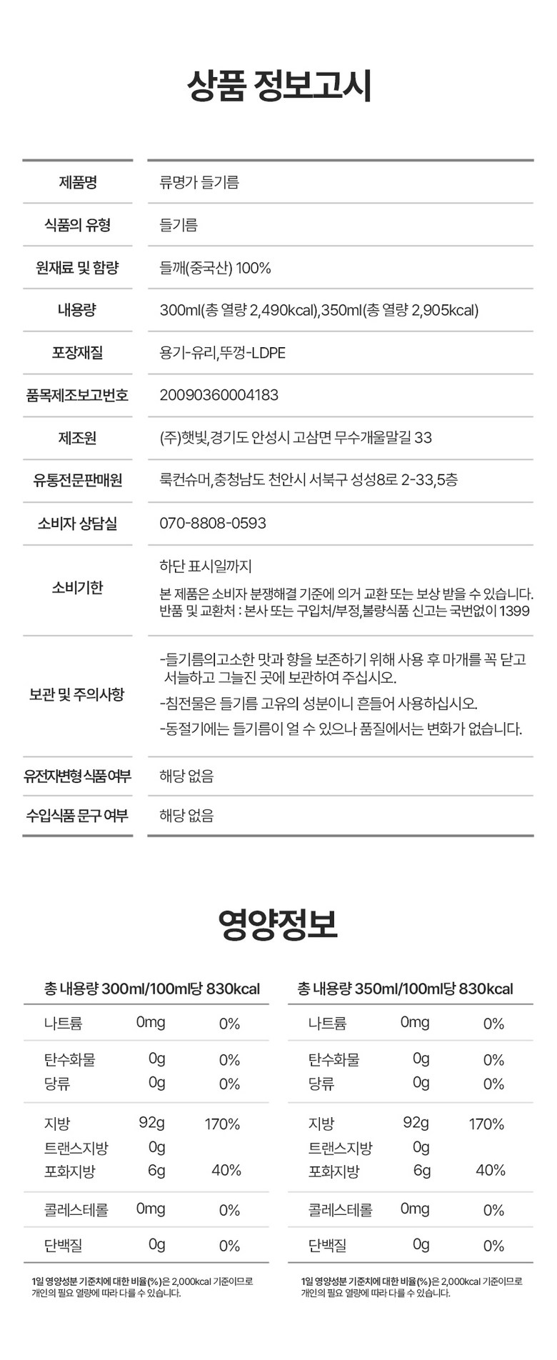 | 포장단위별 내용물의 용량(중량), 수량 | 300ml, 1병 | 원재료명 및 함량 | 원재료명: 통들깨(중국산) 함량: 100% |