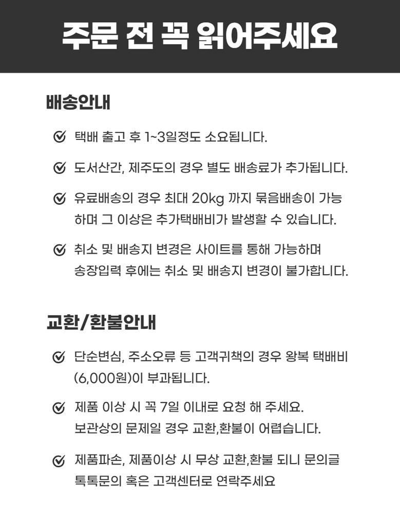 | 교환/반품 비용 (왕복비용) | 6,000원 - 단, 고객 변심의 경우에만 발생 - 도서산간 및 일부 지역 추가비용 발생 |