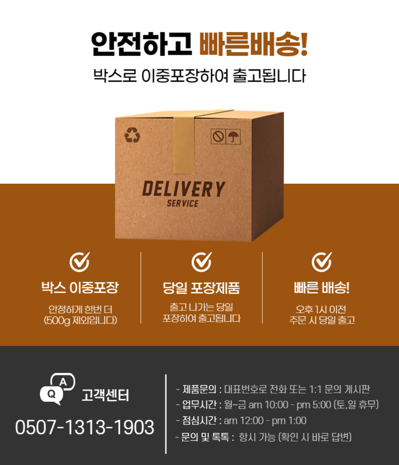 | 배송기간 | ㆍ도서산간 지역 등은 배송에 3-5일이 더 소요될 수 있습니다. - 천재지변, 물량 수급 변동 등 예외적인 사유 발생 시, 다소 지연될 수 있는 점 양해 부탁드립니다. | ||