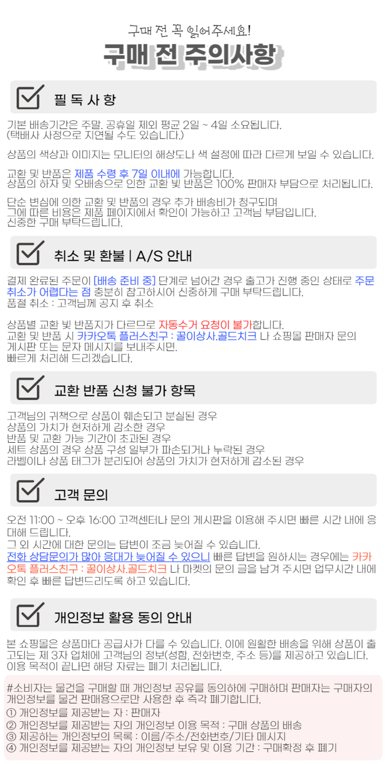 - ㆍ모니터 해상도의 차이로 인해 색상이나 이미지가 실제와 달라, 고객이 단순 변심으로 교환/반품을 무료로 요청하는 경우