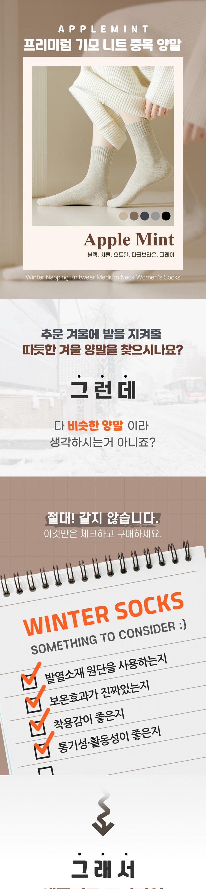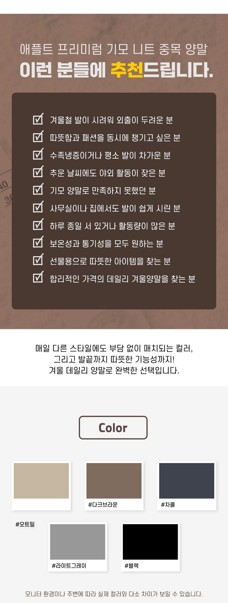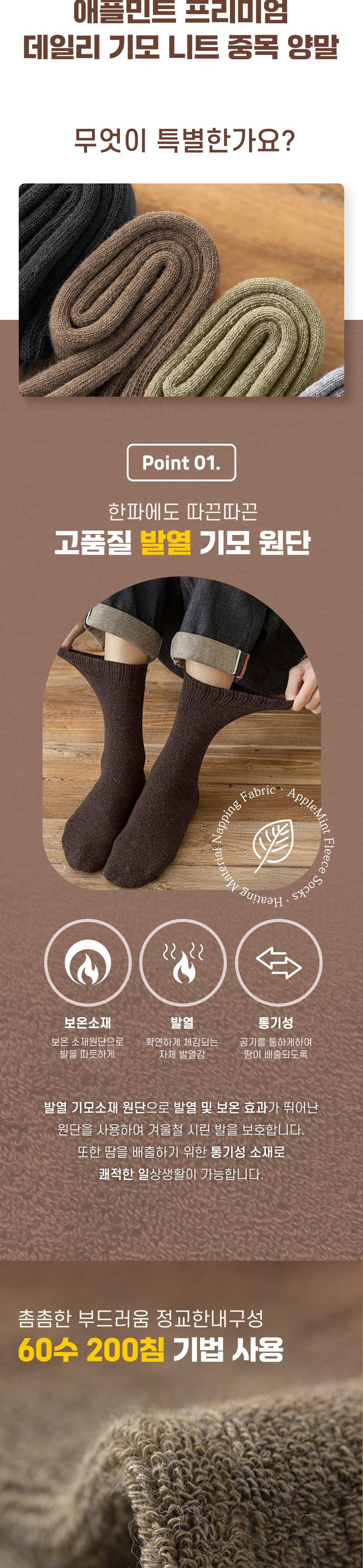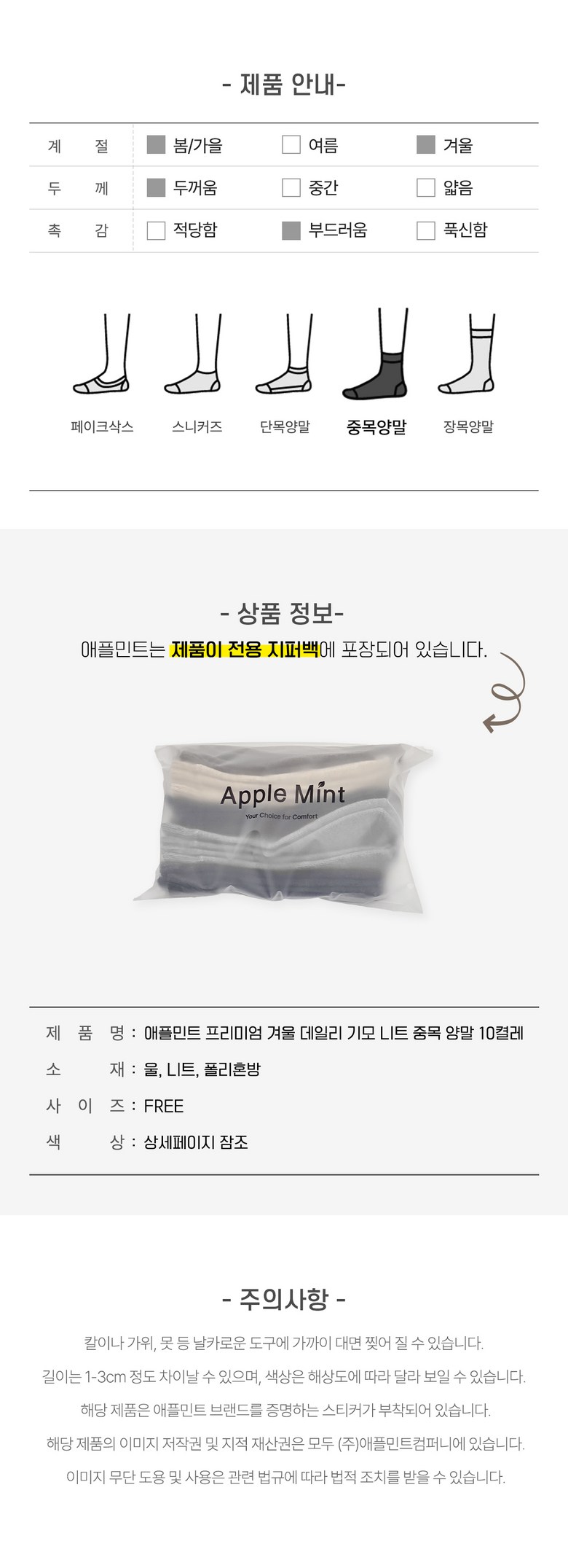 | 품명 및 모델명 | 애플민트 프리미엄 겨울 데일리 기모 니트 중목 양말 10켤레 | 인증/허가 사항 | 상품 상세페이지 참조 |
