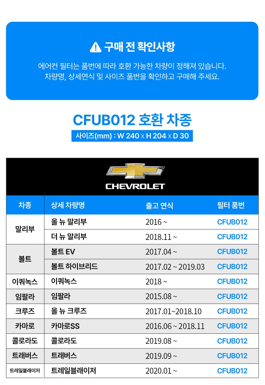 | 품명 및 모델명 | 필터포유 PM 0.3 블루 헤파 자동차 에어컨 히터 필터 트레일블래이저 / 트래버스 / 말리부(2016년~) | 동일모델 출시년월 | 2023.05 |