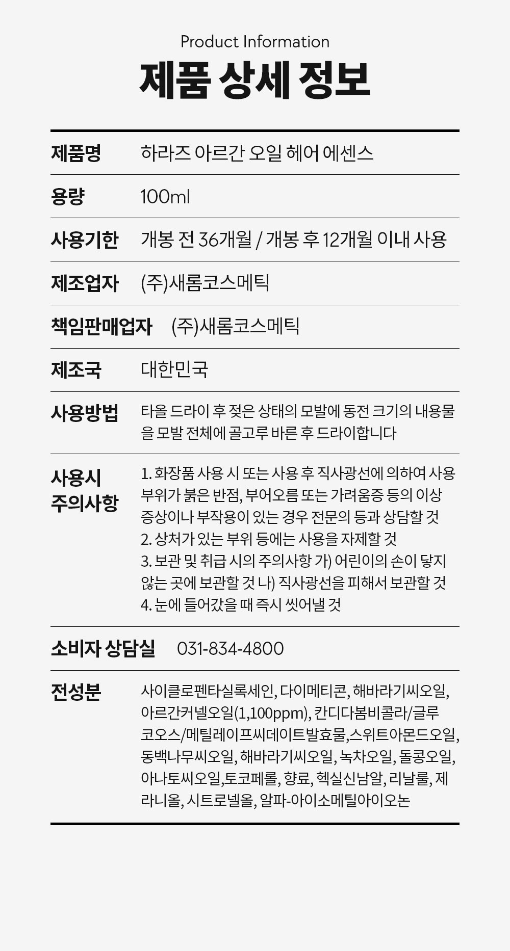 | 용량(중량) | 100ml | 제품 주요 사양 | 모든 모발용 |