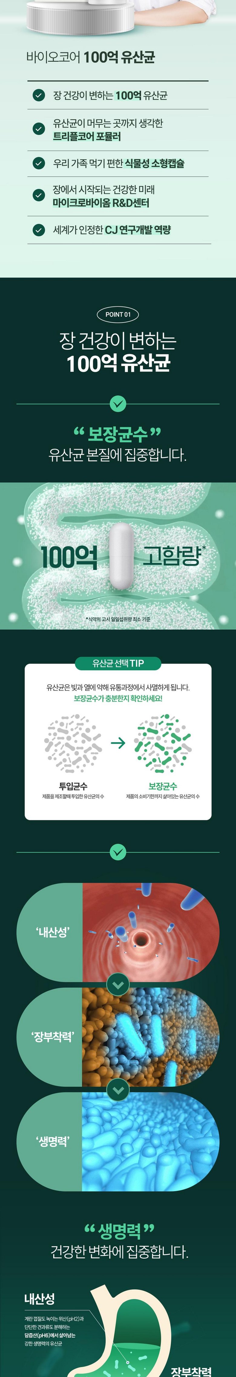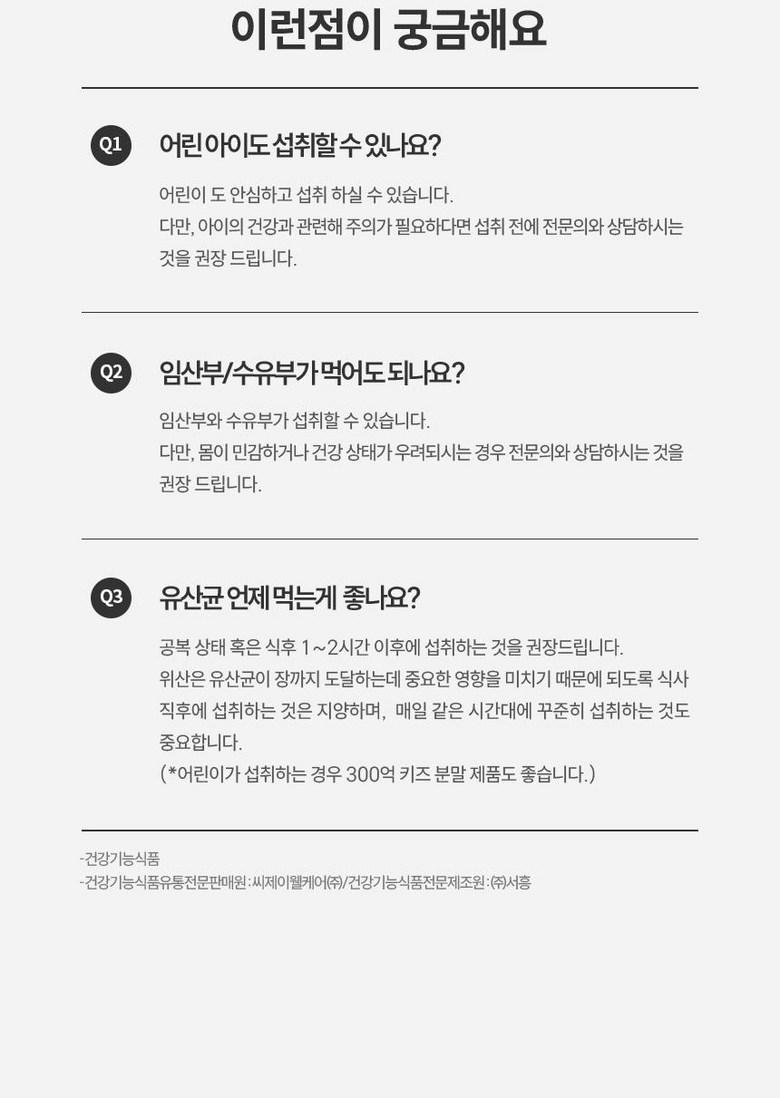 | 제품명 | ■100억 유산균 | 제조업소의 명칭과 소재지 | ■ 건강기능식품 연구개발 및 유통전문판매원 : 씨제이웰케어㈜ / 서울특별시 중구 세종대로 14(남대문로 5가) 그랜드센트럴 5층, 6층■ 건강기능식품 전문제조원 : ㈜서흥 / 충청북도 청주시 흥덕구 오송읍 오송생명로 61 |