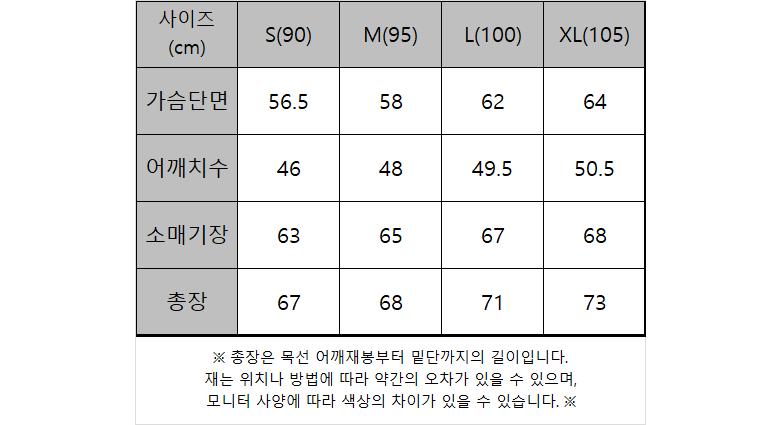 ※ 실측 수치는 재는 사람과 방법에 따라 오차가 발생할 수 있습니다. 사이즈 선택 시 참고용으로만 사용하시기를 부탁드립니다. ※
