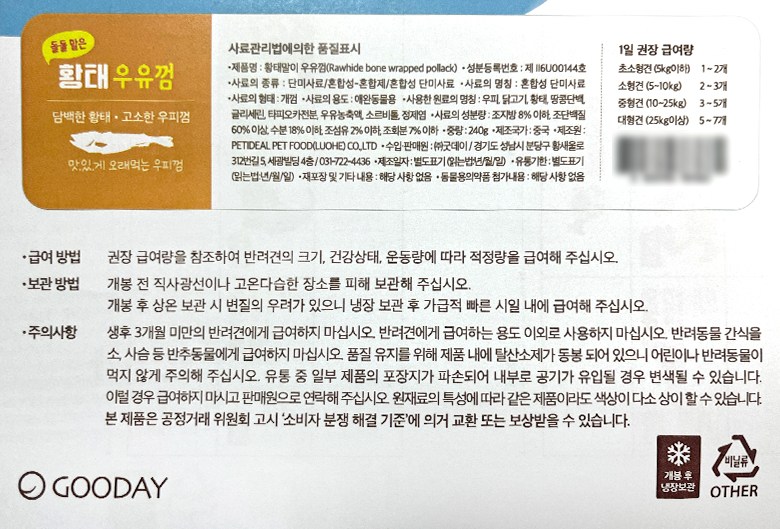 | 품명 및 모델명 | 황태말이 우유껌 | 인증/허가 사항 | 사료관리법에 따른 성분등록번호 : 컨텐츠 참조 |