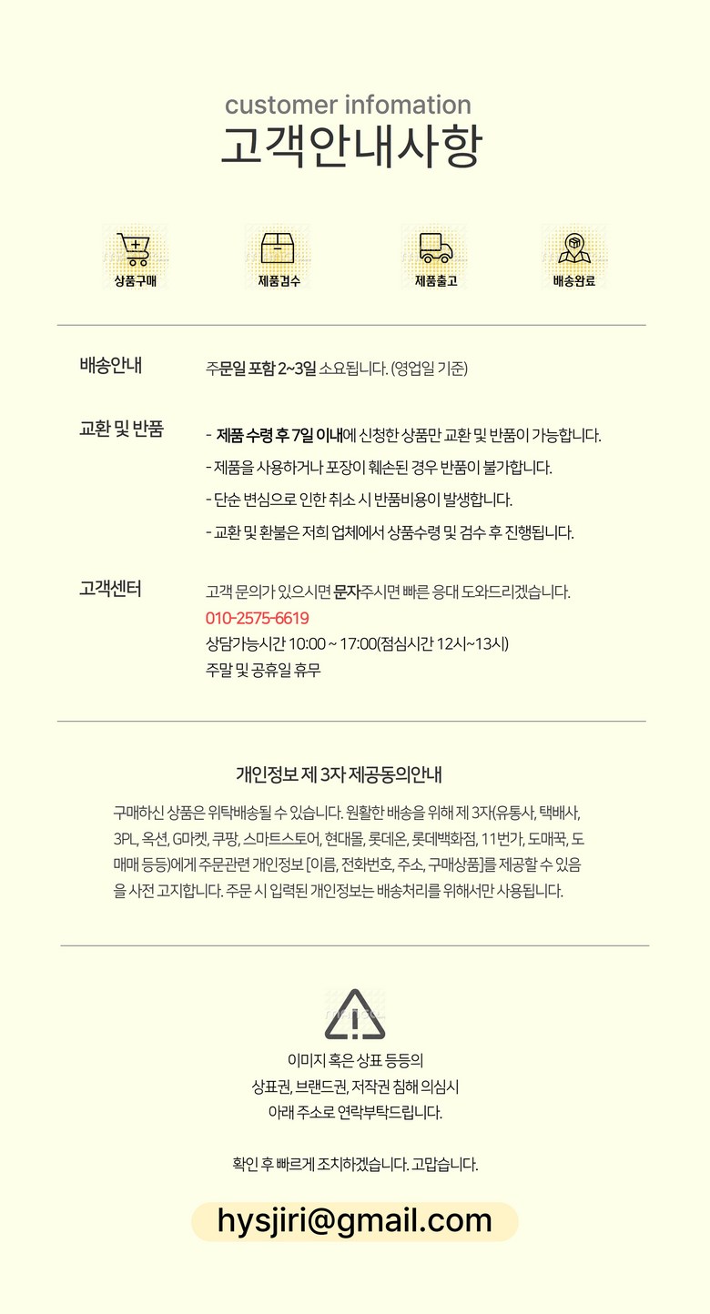 - ㆍ모니터 해상도의 차이로 인해 색상이나 이미지가 실제와 달라, 고객이 단순 변심으로 교환/반품을 무료로 요청하는 경우