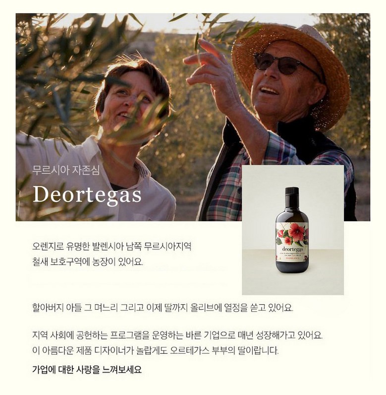 데오르테가스 엑스트라 버진 올리브 오일은 아이디어와 꿈, 강렬한 작업, 땅에 대한 깊은 관심과 존중의 신선하고 세련된 결과입니다. 30년 넘게 올리브 과수원의 유기농 재배에 전념해 온 오랜 농업 역사를 지녔으며, 10년 전 자체 오일 공장을 설립하였고, 이 기간 동안 올리브 나무에 담긴 본질을 발견해 왔습니다. 2008년 고품질의 맛있는 유기농 엑스트라 버진 올리브 오일을 제공하겠다는 명확한 목표를 가지고 자체 오일 프레스를 만들었습니다. 환경을 최대한 존중하면서 제품을 생산하였으며 항상 전통적인 장인 정신과 사랑의 영감을 발휘합니다.