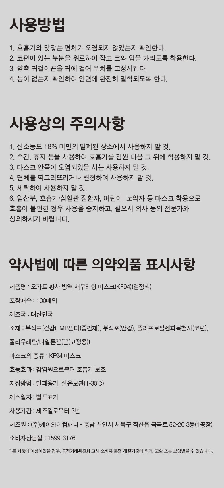 | 품명 및 모델명 | 오가트황사방역새부리형마스크(KF94)(검정색) | 인증/허가 사항 | 의약외품 |