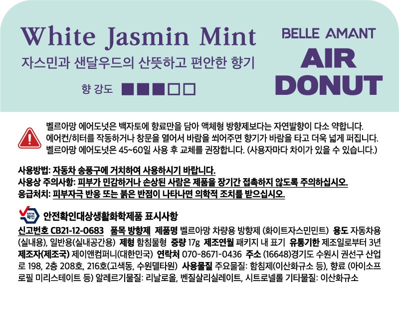 | 품목 및 제품명 | 방향제 / 벨르아망 차량용 방향제 (화이트자스민민트) | 용도(표백제의 경우 계열을 함께표시) 및 제형 | 일반용 (실내공간용), 자동차용 (실내용) / 함침물형 |