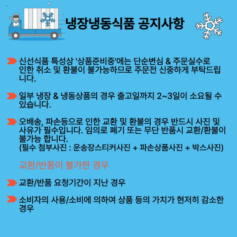 - ㆍ교환/반품에 관한 일반적인 사항은 판매자가 제시사항보다 관계법령이 우선합니다.