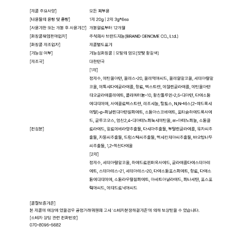 | 화장품제조업자, 화장품책임판매업자 및 맞춤형화장품판매업자 | 상품 상세페이지 참조 | 제조국 | 상품 상세페이지 참조 |