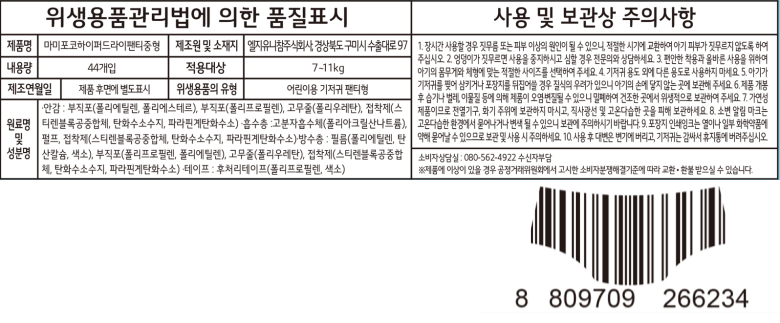 | 품명 및 모델명 | 마미포코 하이퍼드라이 팬티 중형 | 인증/허가 사항 | 위생용품 |