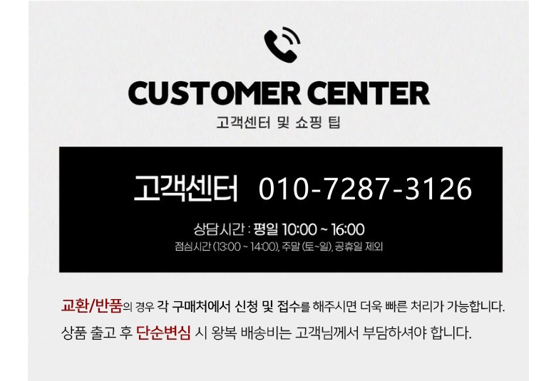 - ㆍ모니터 해상도의 차이로 인해 색상이나 이미지가 실제와 달라, 고객이 단순 변심으로 교환/반품을 무료로 요청하는 경우