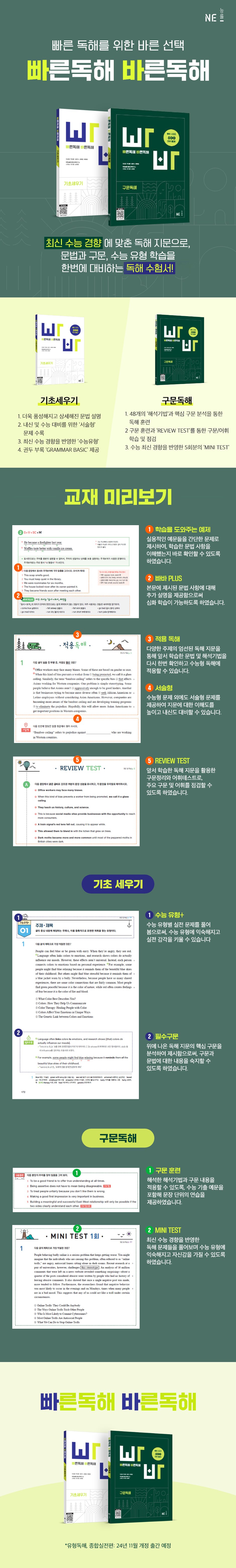 | 도서명 | 빠른독해 바른독해 구문독해(온오프세트) | 저자, 출판사 | NE능률 영어교육연구소, NE능률 |