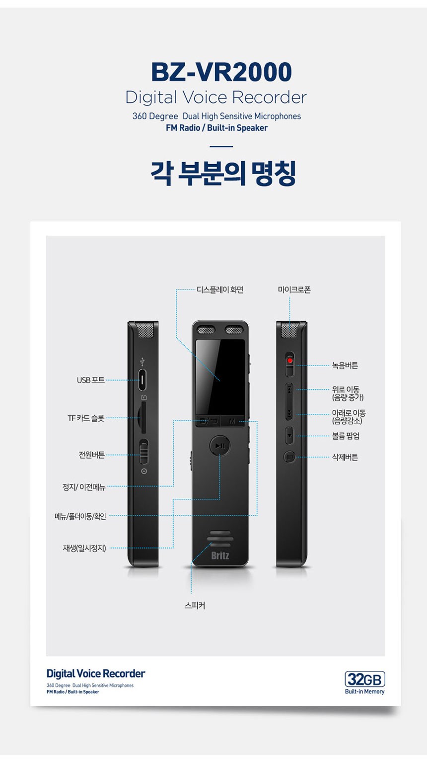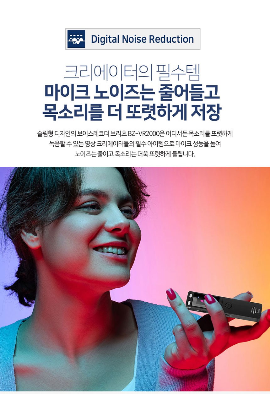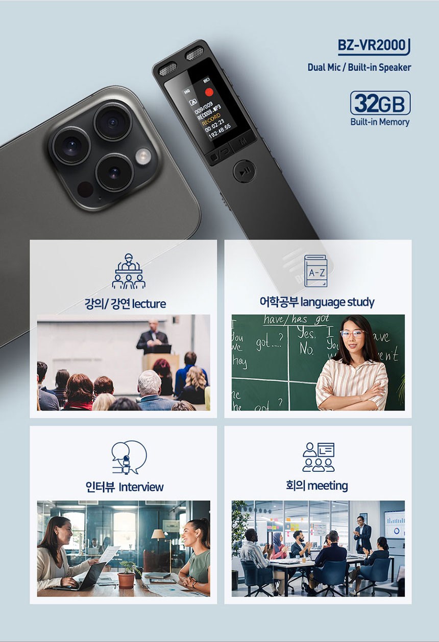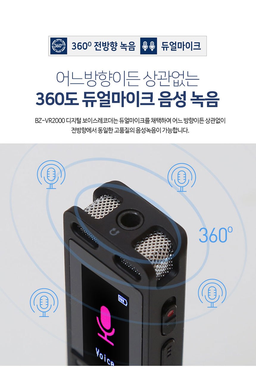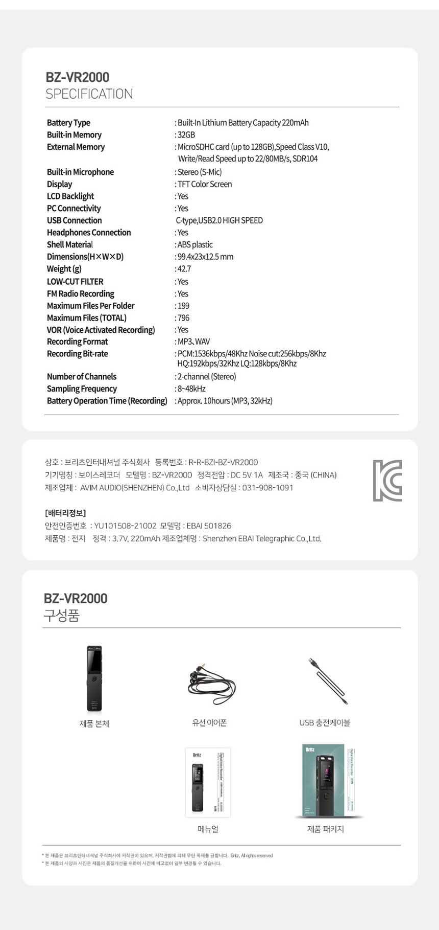 | 품명 및 모델명 | 보이스레코더 / BZ-VR2000 | KC 인증정보 | 본품: R-R-BZI-BZ-VR2000 전지: YU101508-21002E |