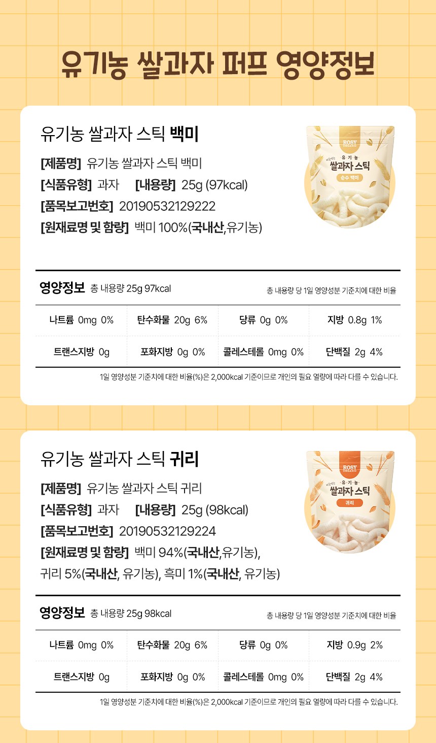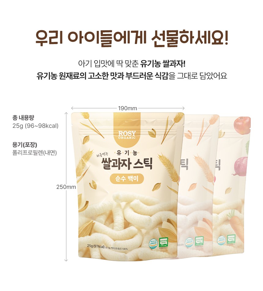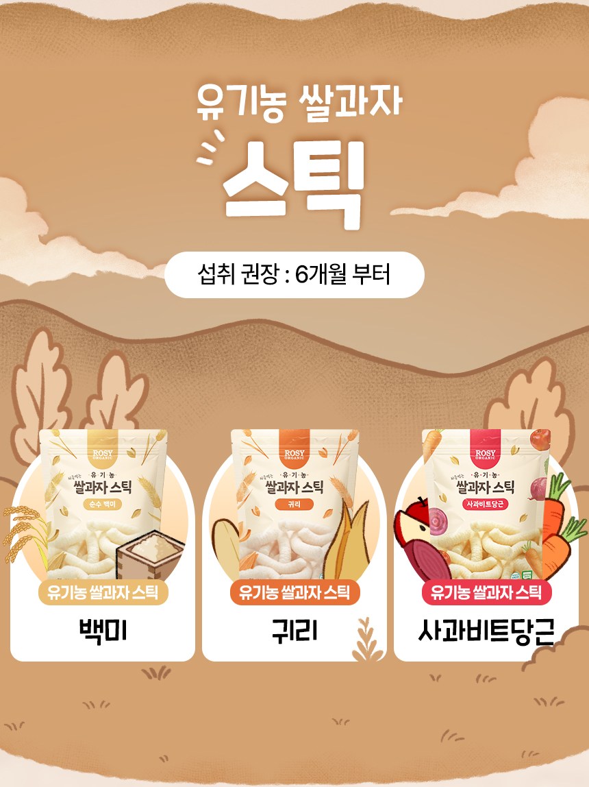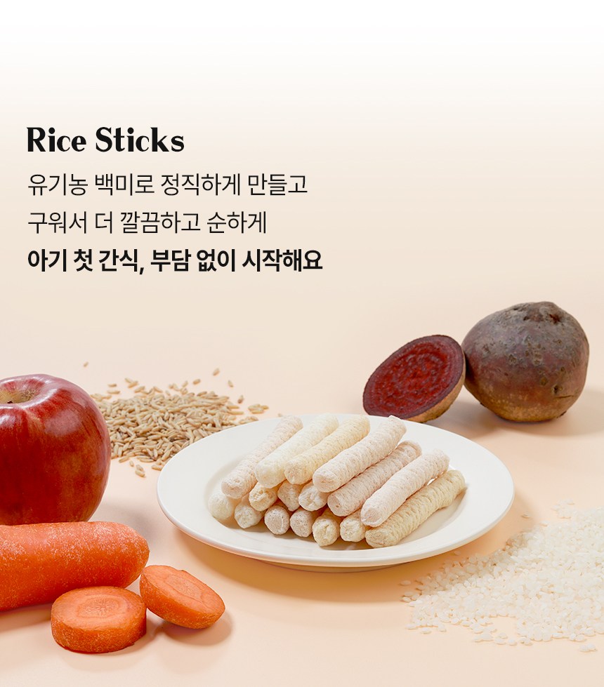 | 제품명 | 유기농 쌀과자 스틱 사과비트당근 + 유기농 쌀과자 스틱 귀리 + 유기농 쌀과자 스틱 순수 백미 | 식품의 유형 | 컨텐츠 참조 |