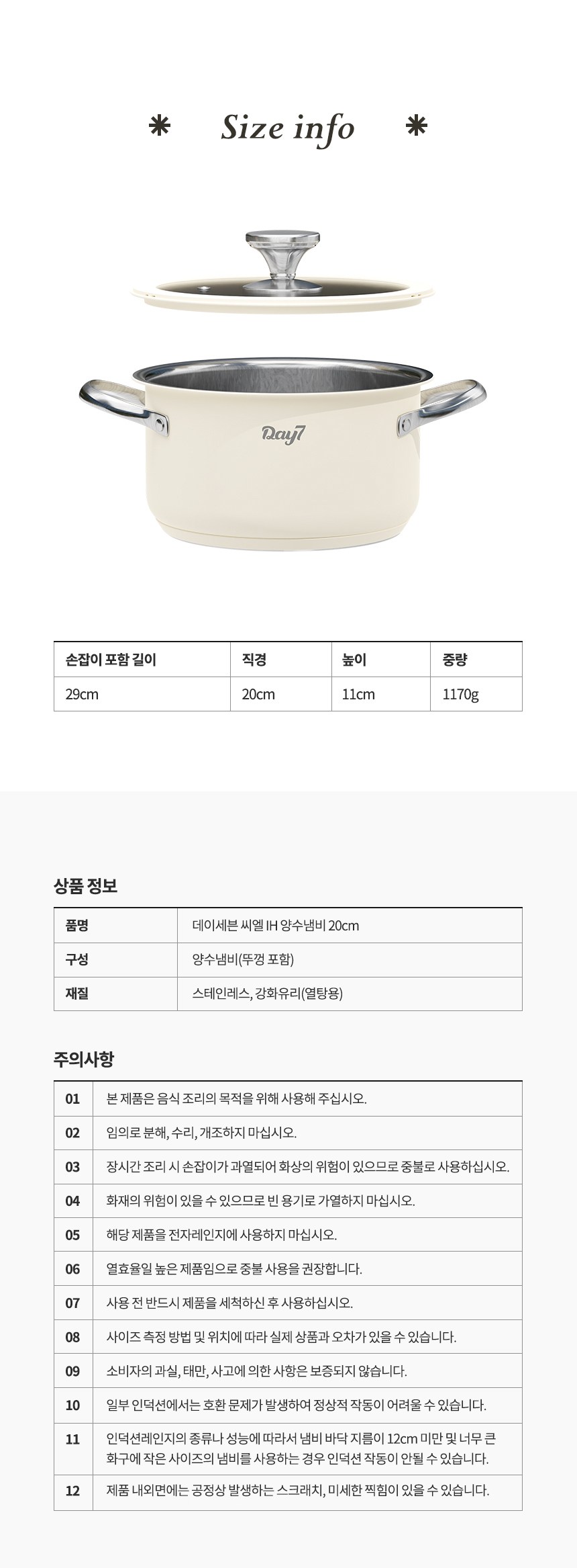 | 품명 및 모델명 | 데이세븐 씨엘 304 IH 양수냄비 20cm | 재질 | 컨텐츠참조 |