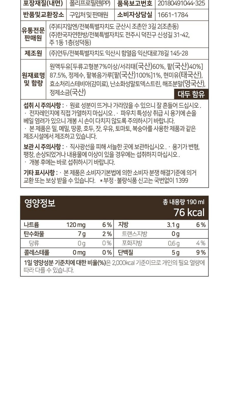 | 생산자 및 소재지 | 상품 상세페이지 참조 | 제조연월일, 소비기한 또는 품질유지기한 | 상품 상세페이지 참조 |