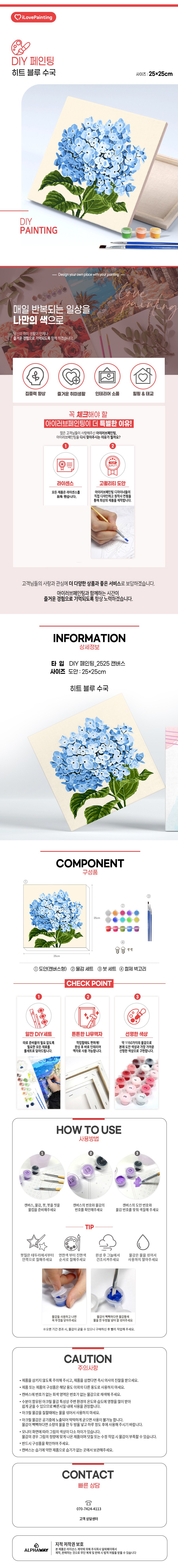 | 품명 및 모델명 | 아이러브페인팅 DIY 히트 그림그리기 정물 꽃 동물 풍경 블루 수국 | 인증/허가 사항 | 해당없음(14세이상) |