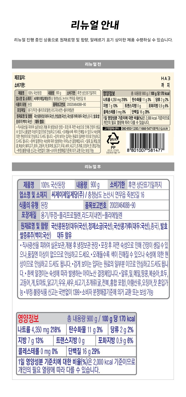| 포장단위별 내용물의 용량(중량), 수량 | 900g x 2개 | 원재료명 및 함량 | 리뉴얼 전, 후: 컨텐츠 참조 |
