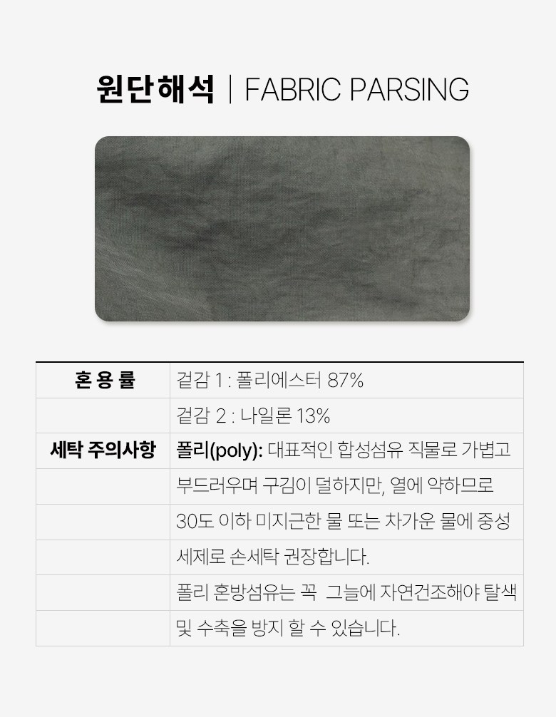 | 제조국 | 중국OEM | 세탁방법 및 취급시 주의사항 | 세탁방법:30도 이하의 온수로 손빨래 권장장시간 물에 담글 경우 탈색 변색의 원인이 될 수 있음표백제나 유연제 사용을 피해주세요!!! 세탁후 자연 바람으로 말리기 다리미 사용 금지취급상 주의사항: 화기주의, 오염주의, 날카로운 물질주의 |