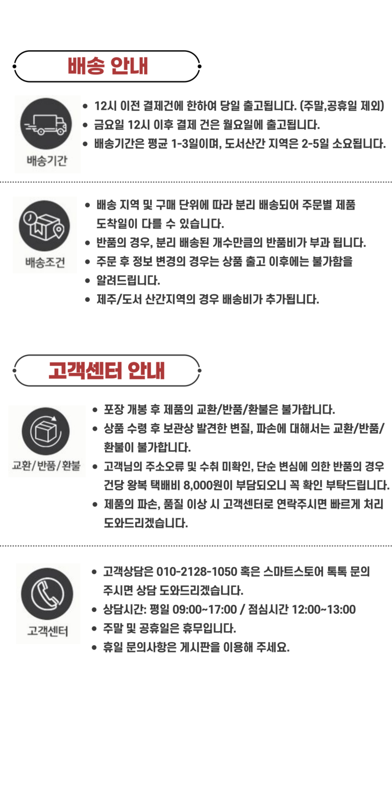 | 배송기간 | ㆍ도서산간 지역 등은 배송에 3-5일이 더 소요될 수 있습니다. - 천재지변, 물량 수급 변동 등 예외적인 사유 발생 시, 다소 지연될 수 있는 점 양해 부탁드립니다. | ||