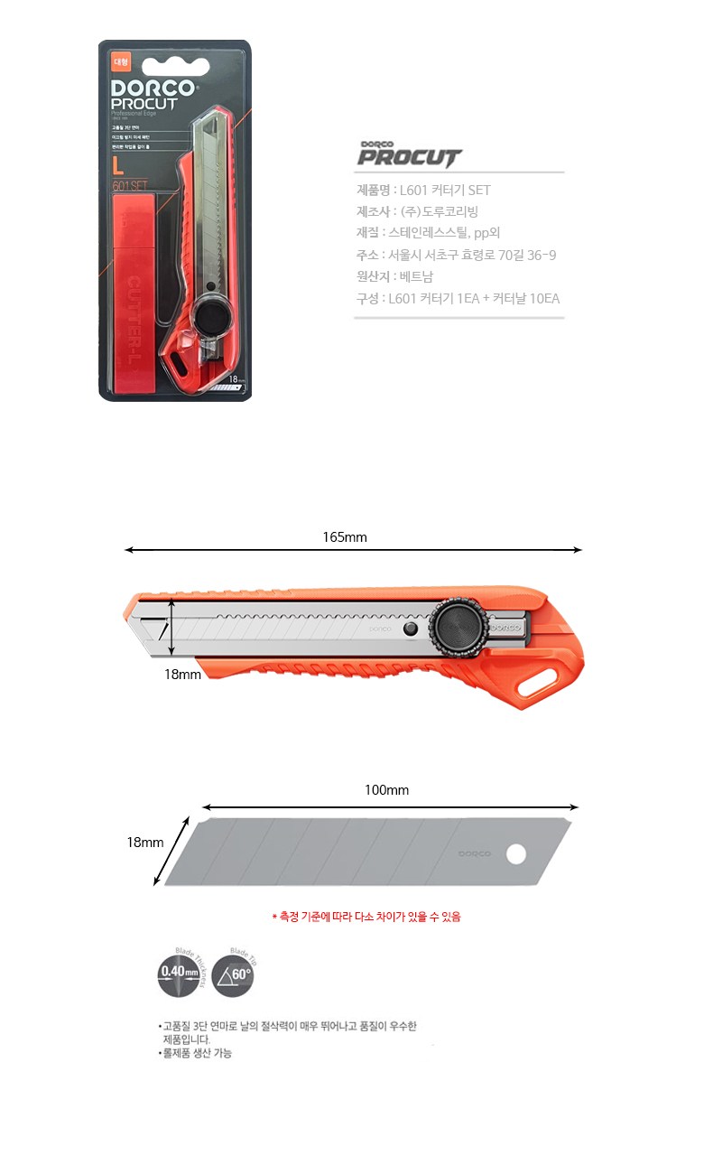 | 품명 및 모델명 | 도루코 L601 대형 커터칼 18mm + L날 커터날 10p 세트 | 인증/허가 사항 | 해당없음 |