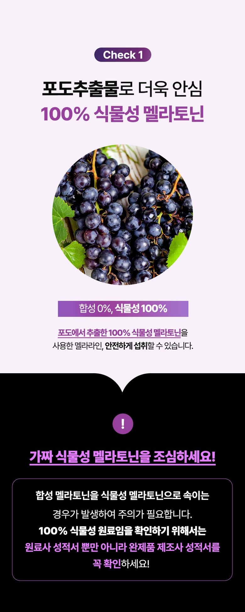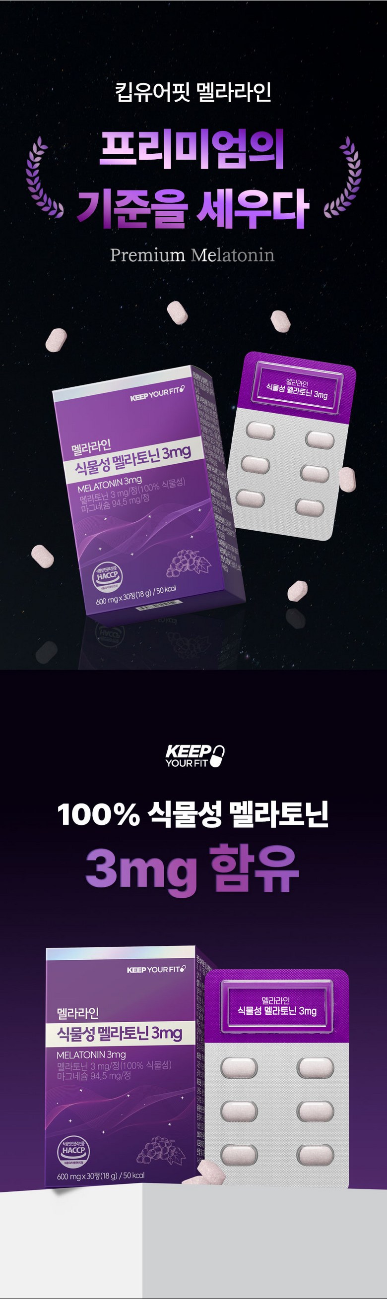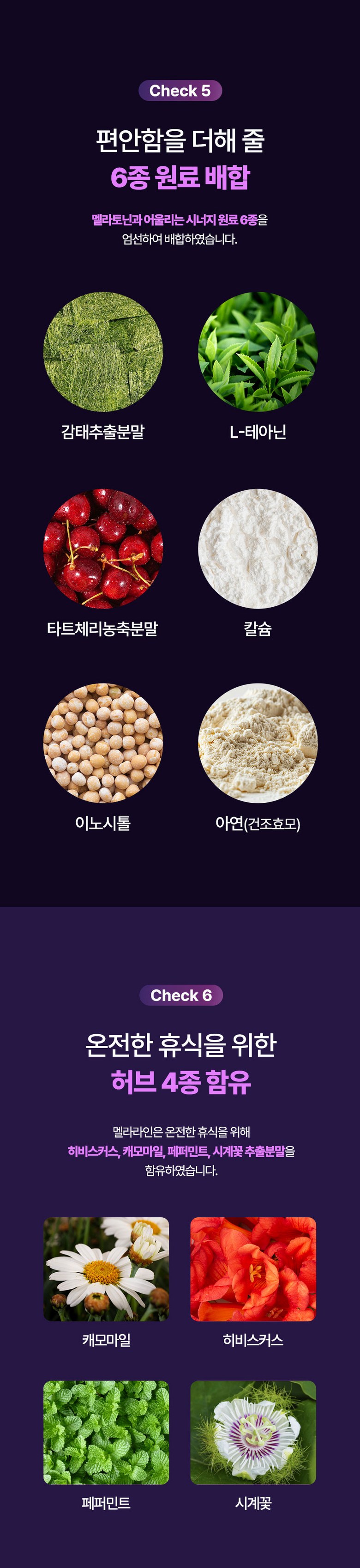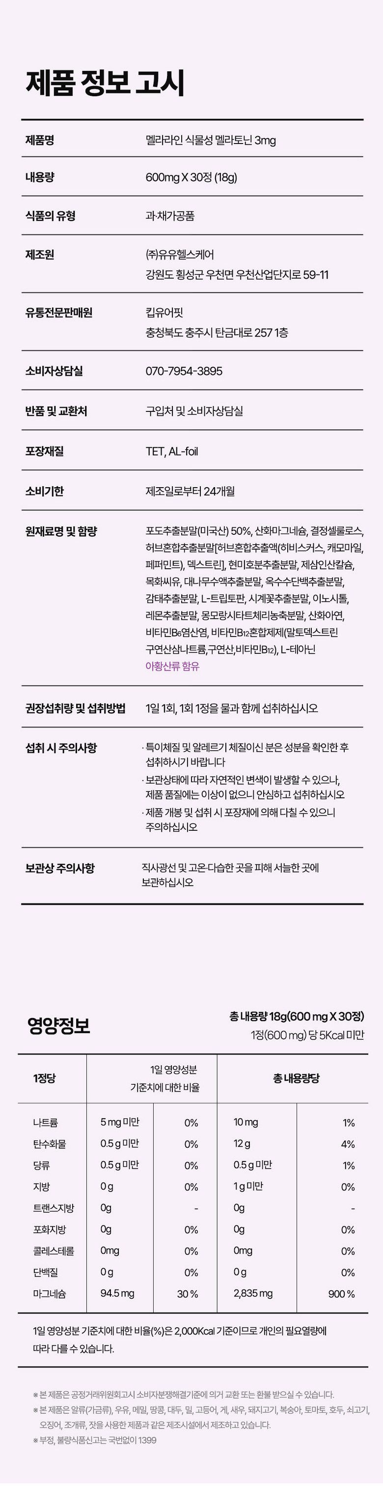 | 원재료명 및 함량 | 포도추출분말(미국산) 50%, 산화마그네슘, 결정셀룰로스, 허브혼합추출분말[허브혼합추출액(히비스커스, 이집트산, 캐모마일/크로아티아산, 페퍼민트/이집트산), 덱스트린], 현미호분추출분말(현미/국산), 제삼인산칼슘, 목화씨유, 대나무수액추출분말, 옥수수단백추출분말, 감태추출분말, L-트립토판, 시계꽃추출분말, 이노시톨, 레몬추출분말 0.1%, 몽모랑시타트체리농축분말 0.1%, 산화아연, 비타민B6염산염, 비타민B12혼합제제(말토덱스트린, 구연산삼나트륨, 구연산, 비타민B12), L-테아닌 | 영양성분 | 영양정보(1정 기준)열량 5 kcal 미만, 나트륨 5 mg 미만, 탄수화물 0.5 g 미만, 당류 0.5 g 미만, 지방 0 g, 트랜스지방 0 g, 포화지방 0 g, 콜레스테롤 0 mg, 단백질 0 g, 마그네슘 94.5 mg |