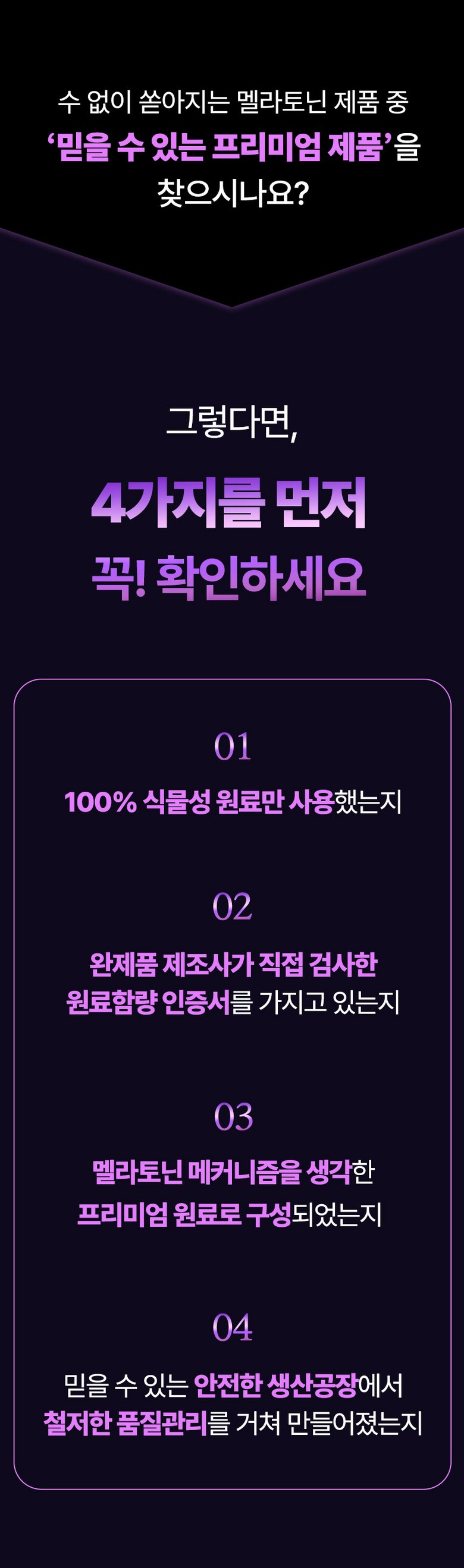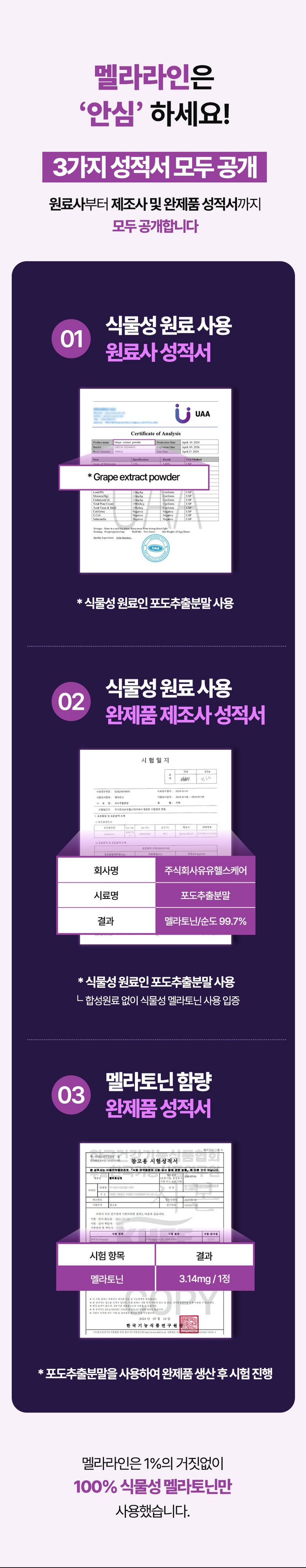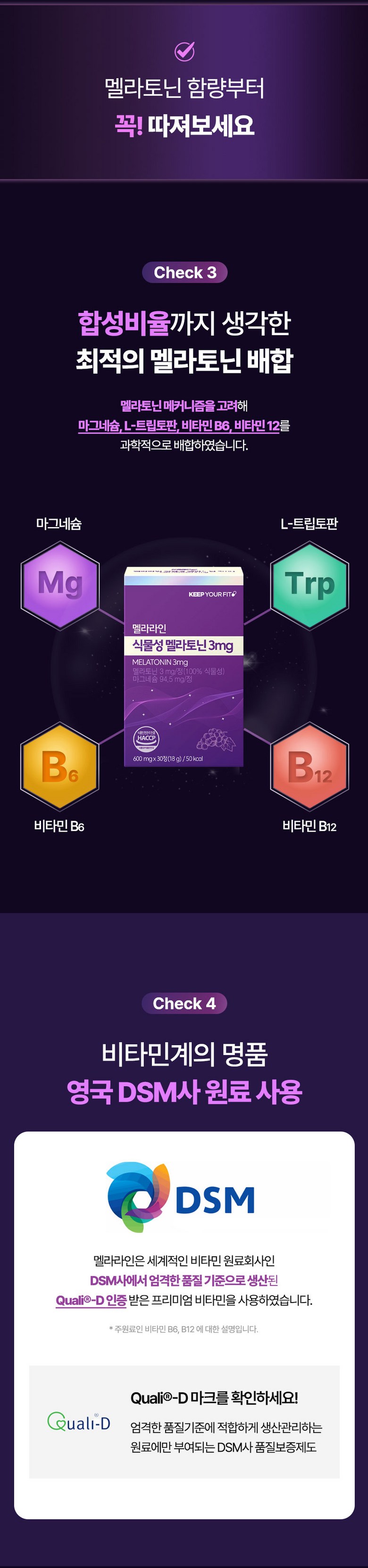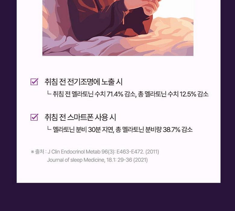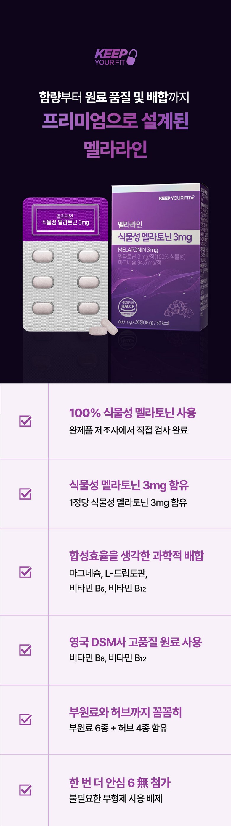 | 원재료명 및 함량 | 포도추출분말(미국산) 50%, 산화마그네슘, 결정셀룰로스, 허브혼합추출분말[허브혼합추출액(히비스커스, 이집트산, 캐모마일/크로아티아산, 페퍼민트/이집트산), 덱스트린], 현미호분추출분말(현미/국산), 제삼인산칼슘, 목화씨유, 대나무수액추출분말, 옥수수단백추출분말, 감태추출분말, L-트립토판, 시계꽃추출분말, 이노시톨, 레몬추출분말 0.1%, 몽모랑시타트체리농축분말 0.1%, 산화아연, 비타민B6염산염, 비타민B12혼합제제(말토덱스트린, 구연산삼나트륨, 구연산, 비타민B12), L-테아닌 | 영양성분 | 영양정보(1정 기준)열량 5 kcal 미만, 나트륨 5 mg 미만, 탄수화물 0.5 g 미만, 당류 0.5 g 미만, 지방 0 g, 트랜스지방 0 g, 포화지방 0 g, 콜레스테롤 0 mg, 단백질 0 g, 마그네슘 94.5 mg |