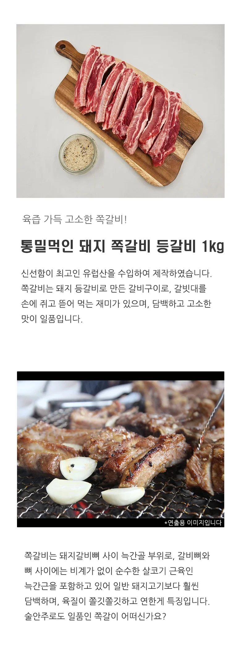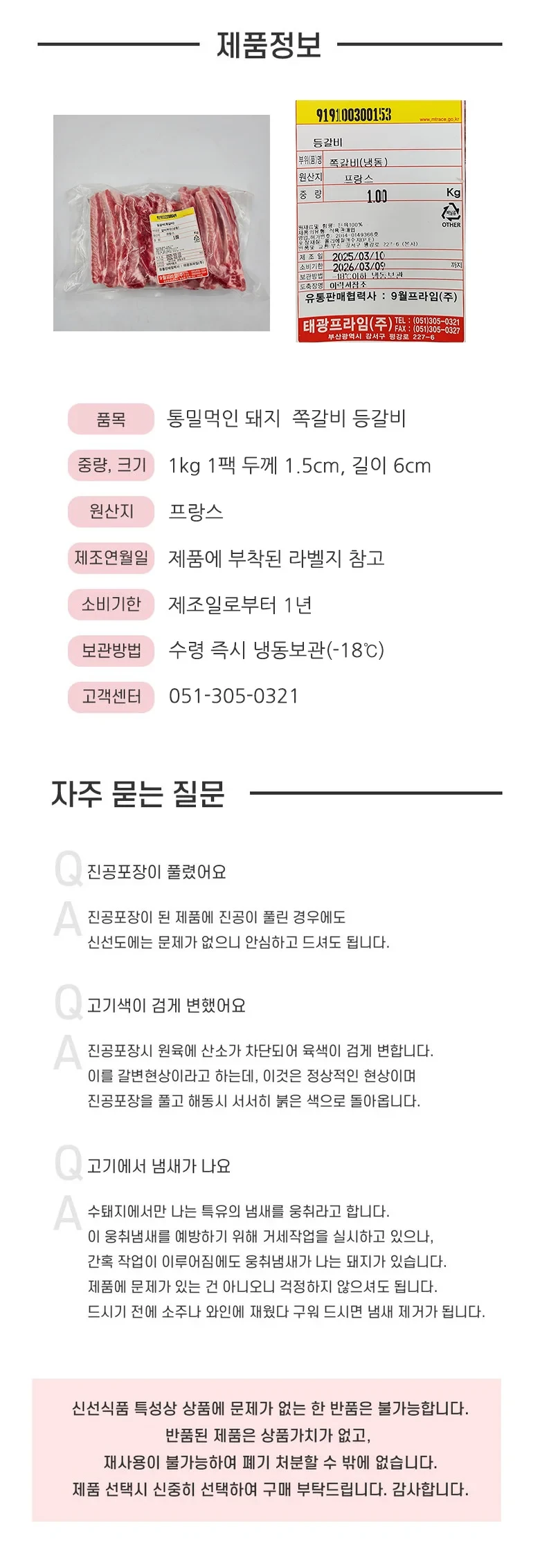 | 품목 또는 명칭 | 돼지고기 등갈비(쪽갈비) | 포장단위별 내용물의 용량(중량),수량,크기 | 1kg , 1팩 , 2팩 ......5백 길이 4~14cm |