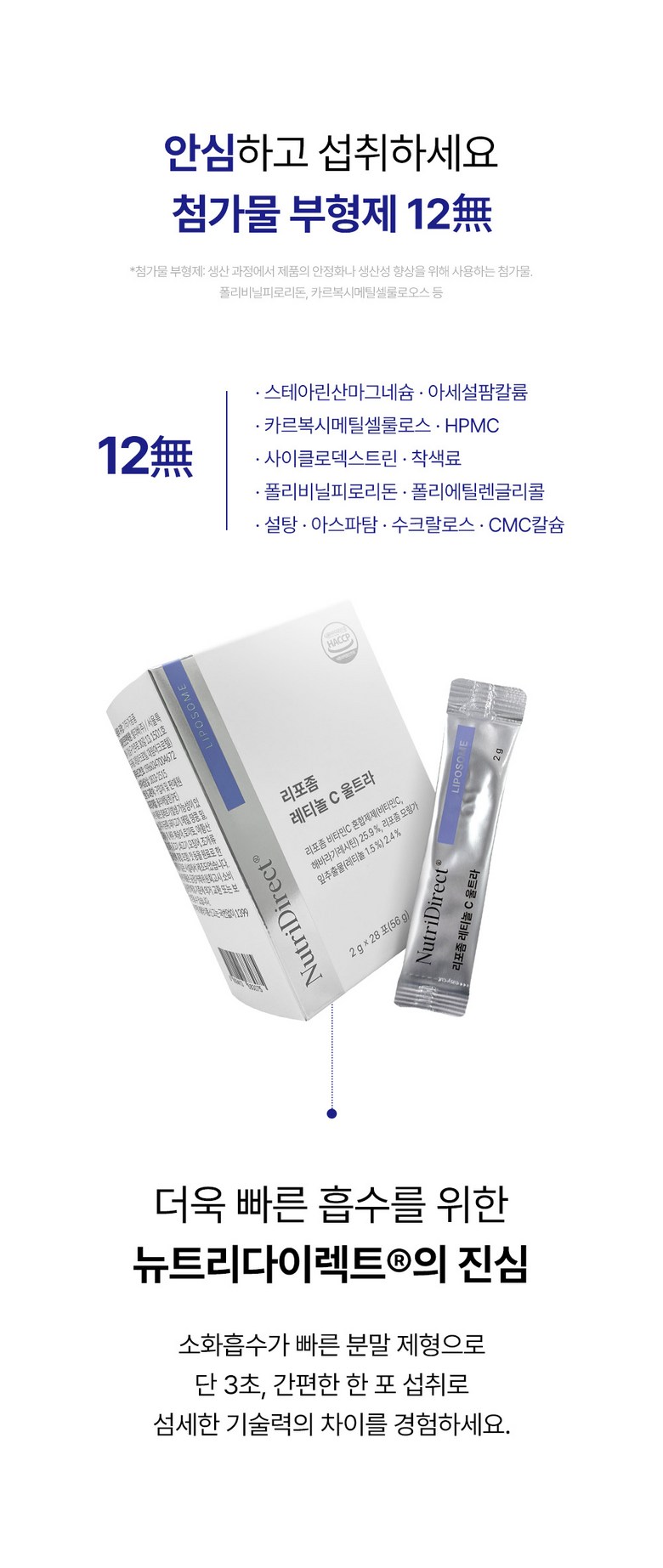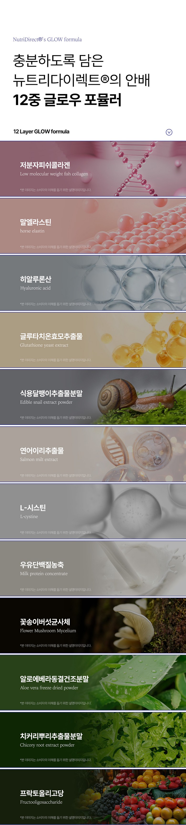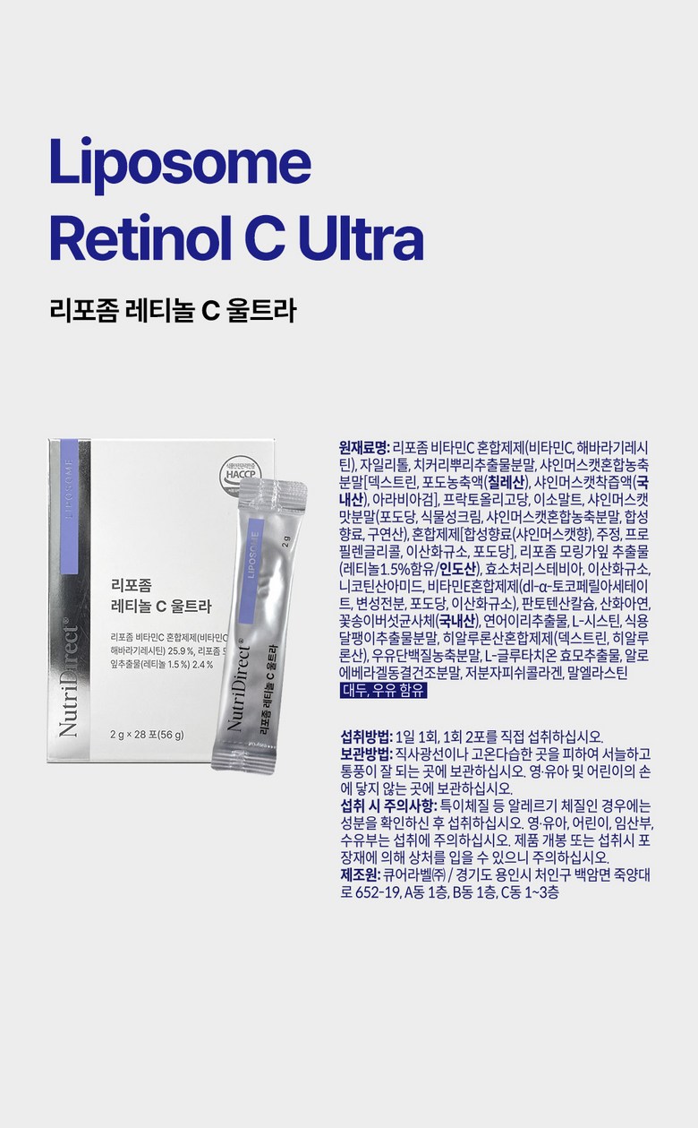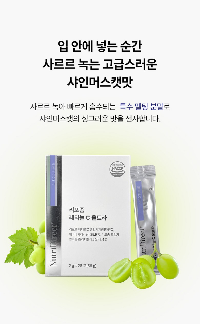 | 원재료명 및 함량 | 리포좀비타민C 혼합제제(비타민C, 해바라기레시 틴), 자일리톨, 치커리뿌리추출물분말, 샤인머스캣혼합농축 분말[덱스트린, 포도농축액(칠레산), 샤인머스캣착즙액(국 내산), 아라비아검], 프락토올리고당, 이소말트, 샤인머스캣 맛분말(포도당,식물성크림, 샤인머스캣혼합농축분말, 합성 향료, 구연산),혼합제제[합성향료(샤인머스캣향), 주정, 프로 필렌글리콜, 이산화규소, 포도당], 리포좀 모링가잎 추출물 (레티놀1.5%함유/인도산),효소처리스테비아, 이산화규소, 니코틴산아미드, 비타민E혼합제제(dl-a-토코페릴아세테이 트, 변성전분, 포도당, 이산화규소), 판토텐산칼슘, 산화아연, 꽃송이버섯균사체(국내산), 연어이리추출물, L-시스틴, 식용 달팽이추출물분말, 히알루론산혼합제제(덱스트린, 히알루 론산),우유단백질농축분말,L-글루타치온 효모추출물, 알로 에베라겔동결건조분말, 저분자피쉬콜라겐, 말엘라스틴 대두, 우유 함유 | 영양성분 | 상품 상세페이지 참조 |
