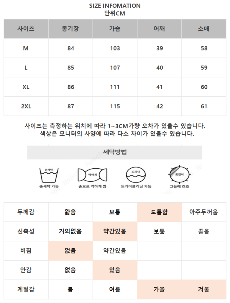 | 제조국 | 중국 | 세탁방법 및 취급시 주의사항 | 상품 상세페이지 참조 |