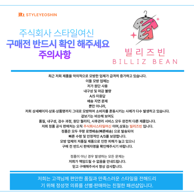 - ㆍ모니터 해상도의 차이로 인해 색상이나 이미지가 실제와 달라, 고객이 단순 변심으로 교환/반품을 무료로 요청하는 경우