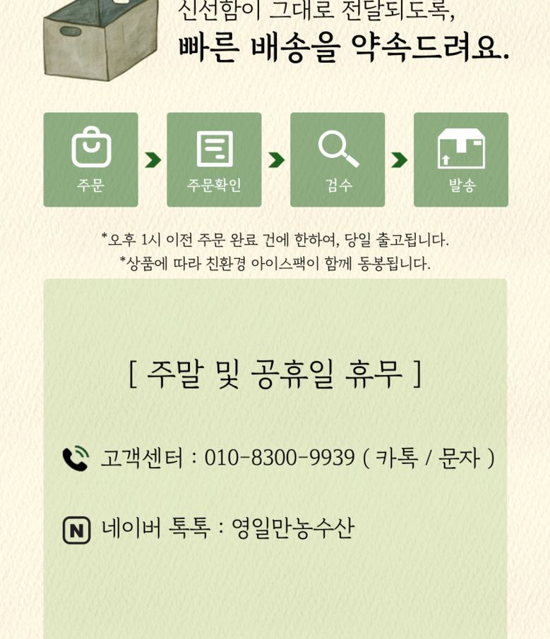 | 배송방법 | 신선/냉장/냉동 | 배송비 | 무료배송 - 도서산간 지역 배송불가 |