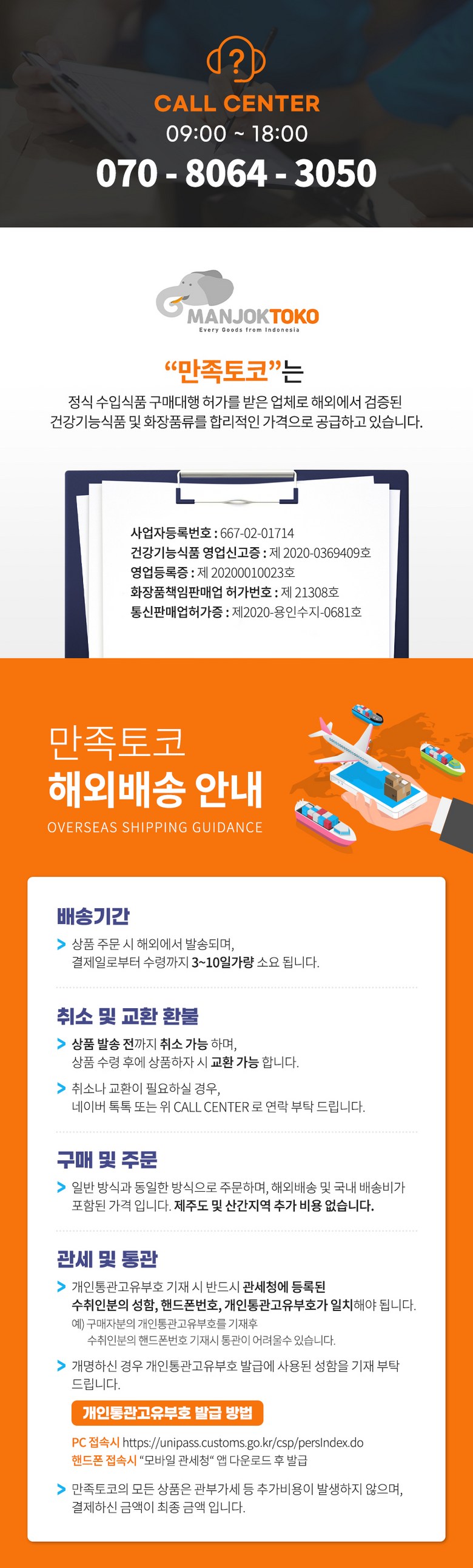 - 법규 개정에 따라 개인통관고유부호 검증 절차가 강화되었습니다. 결제 단계에서 받는 사람의 정보가 관세청 등록 정보 (성명, 휴대폰, 개인통관고유부호, 주소) 와 일치하는지 확인해주세요.