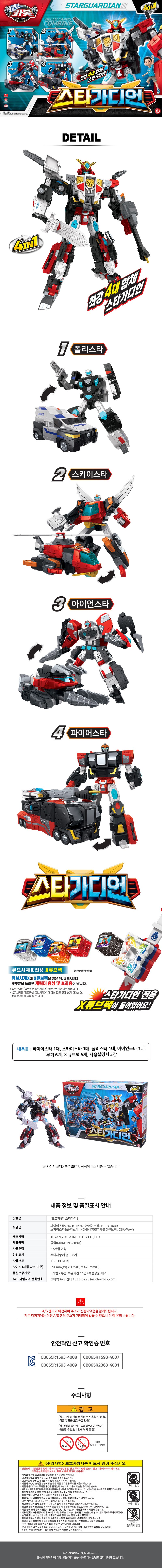 | 품명 및 모델명 | 헬로카봇 스타가디언 | KC 인증정보 | 파이어스타: CB065R1593-4008, 아이언스타: CB065R1593-4007, 스카이스타&폴리스타: CB065R1593-4009, 카봇X큐브팩: CB065R2363-4001 |