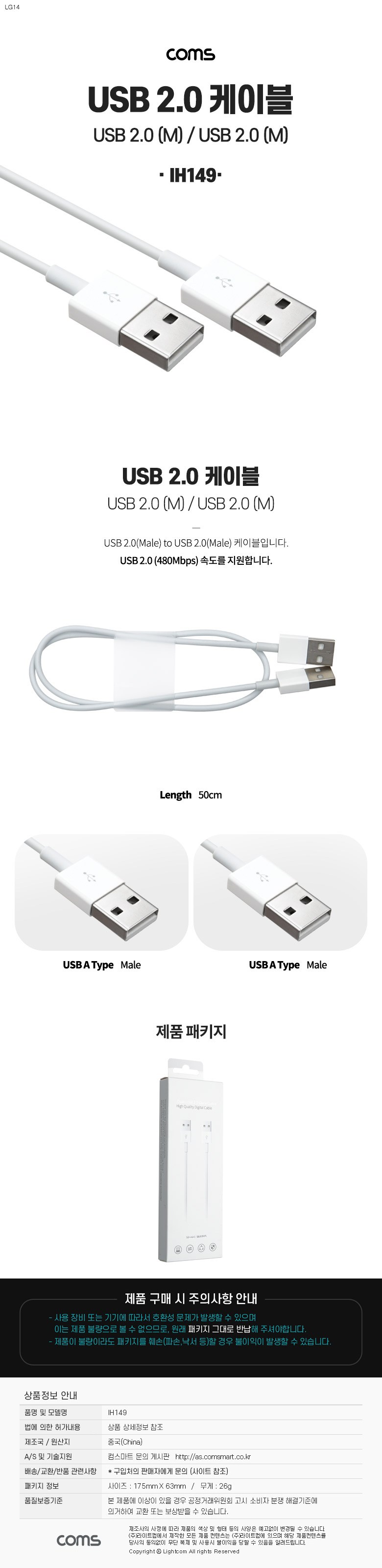 | 품명 및 모델명 | Coms USB 2.0 케이블 50Cm A타입 AA형 AM to AM USB-A to USB-A IH149 1개 IH149 | 인증/허가 사항 | 해당없음 |