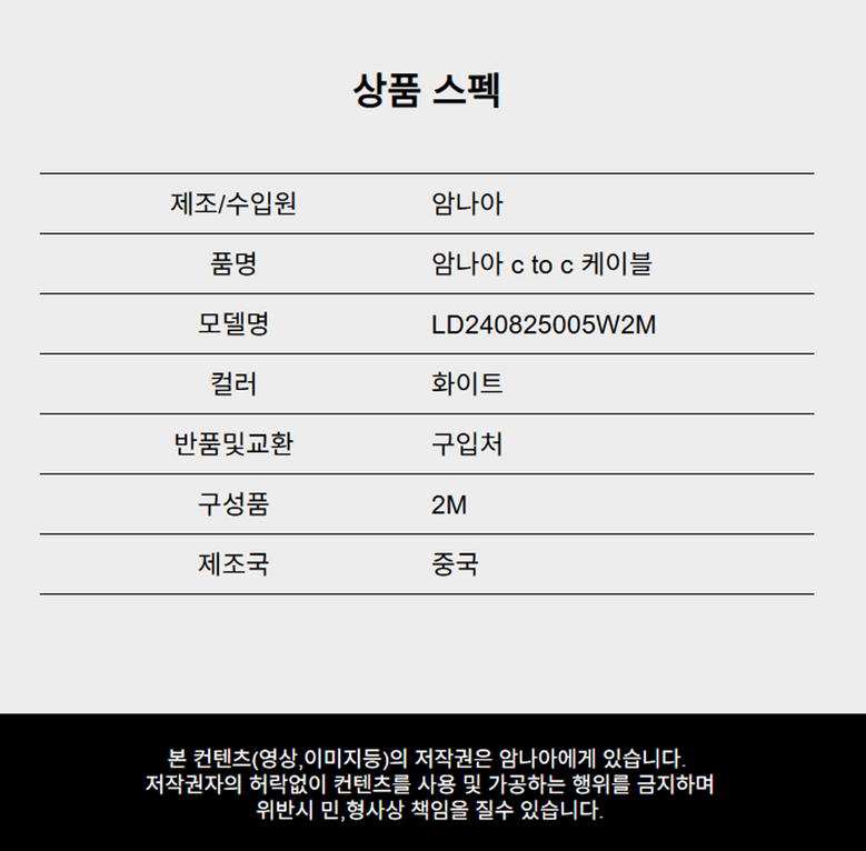 | 제조국(원산지) | 중국(암나아) | 제조자(수입자) | 암나아 |