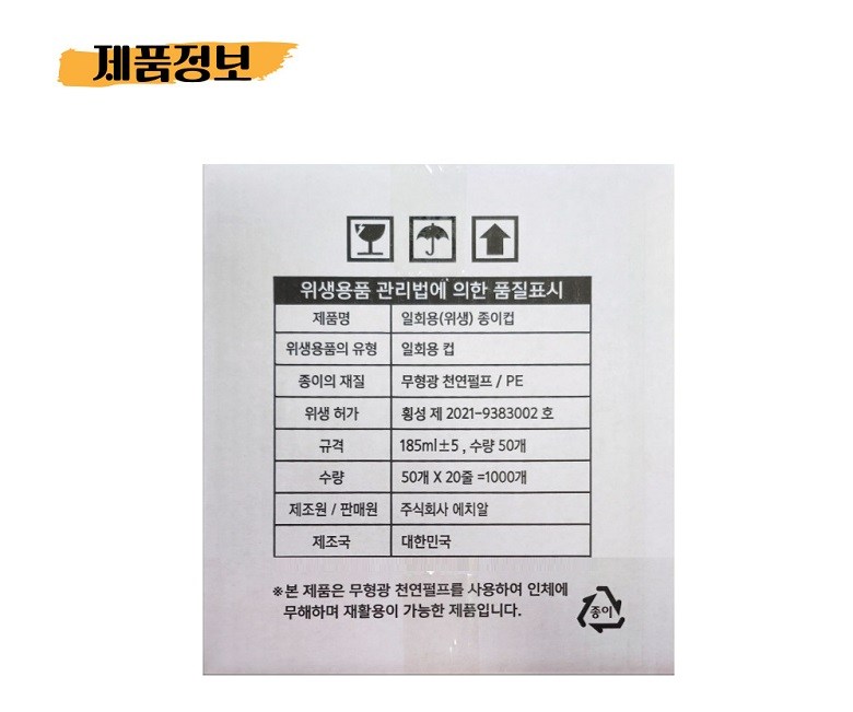 | 품명 및 모델명 | 종이컵 | 인증/허가 사항 | 상품 상세페이지 참조 |