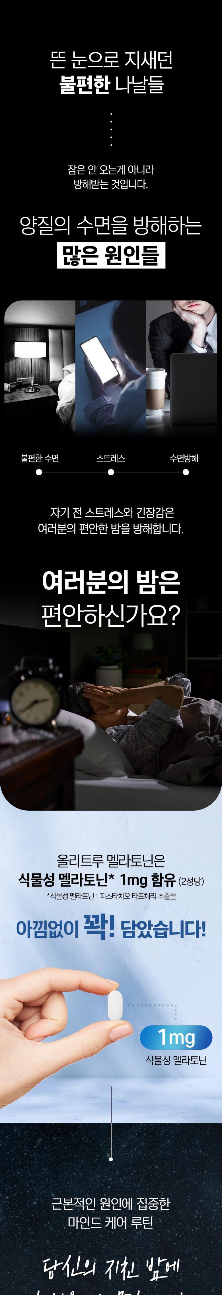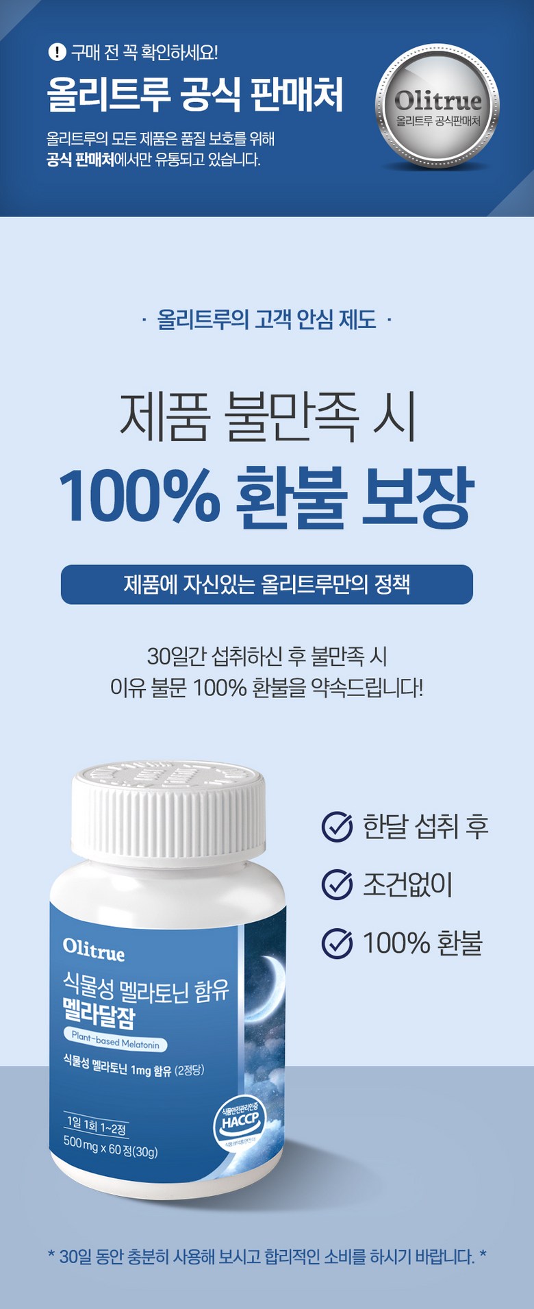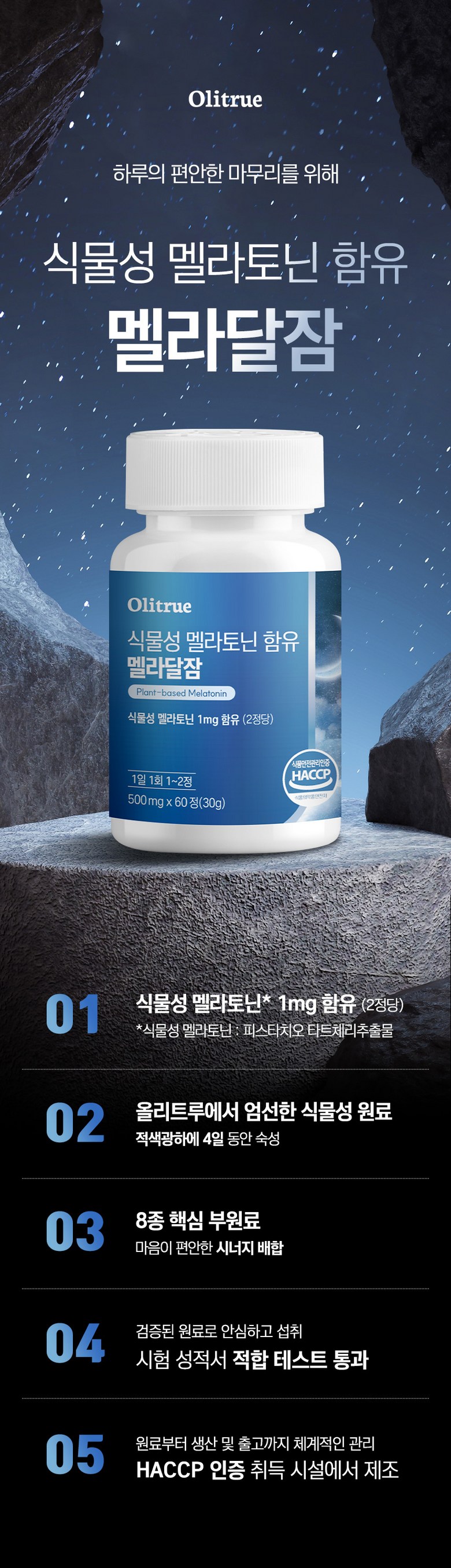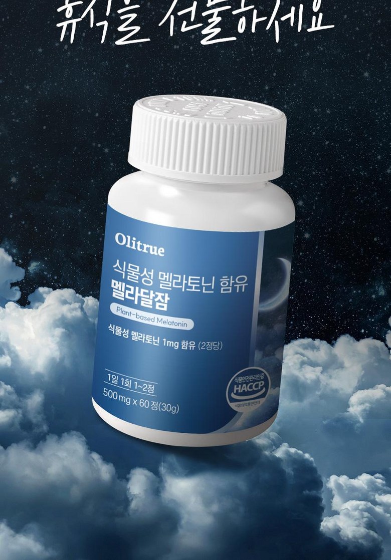 | 제품명 | 올리트루 식물성 멜라토닌 함유 멜라달잠 | 제조업소의 명칭과 소재지 | 올리트루 협력사 |