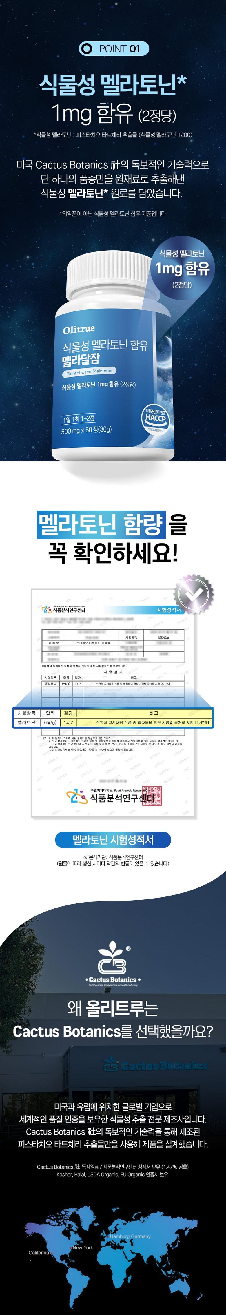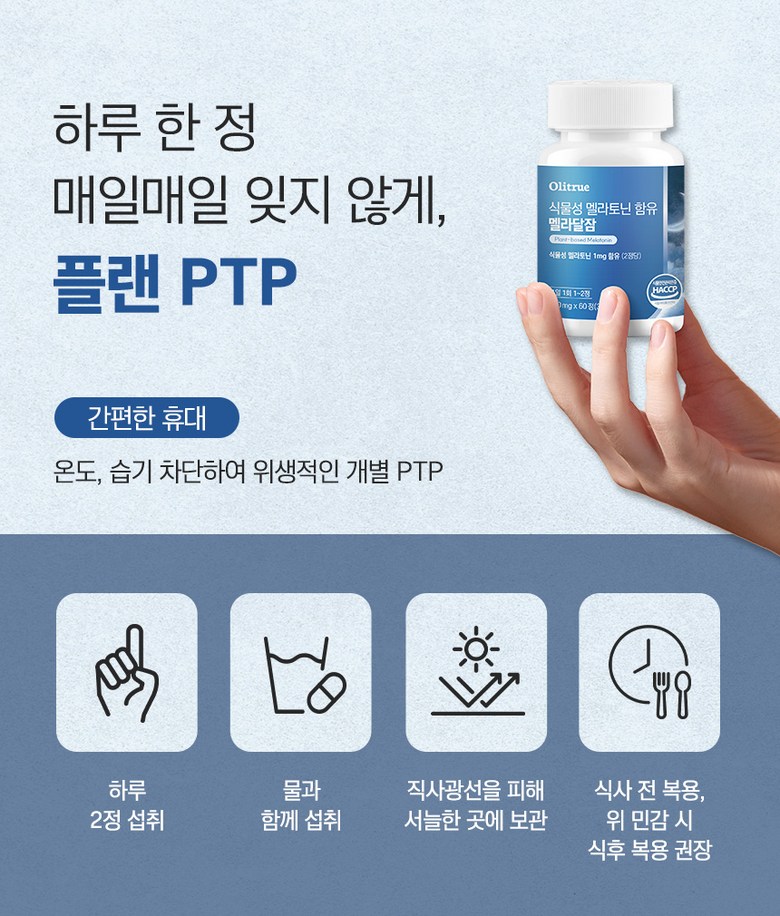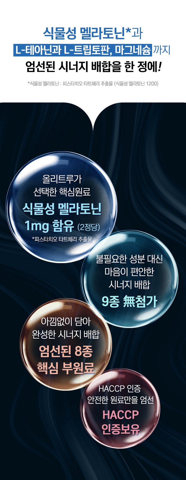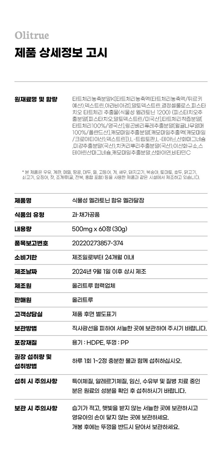 | 제품명 | 올리트루 식물성 멜라토닌 함유 멜라달잠 | 제조업소의 명칭과 소재지 | 올리트루 협력사 |