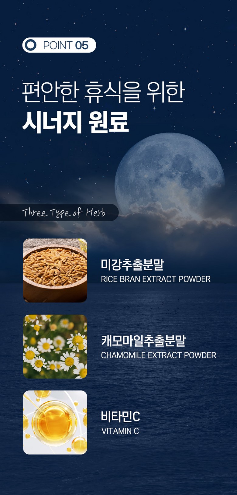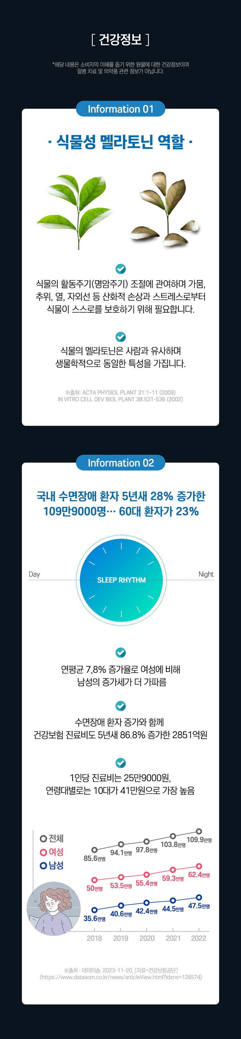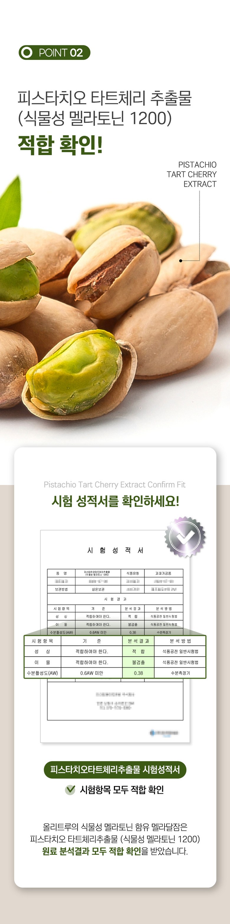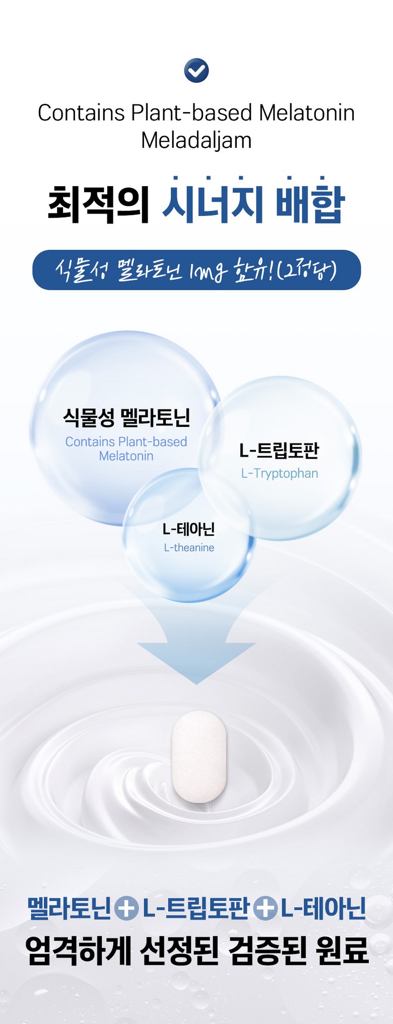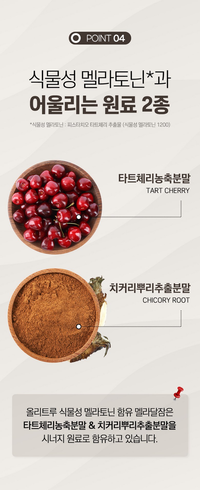 | 원료명 및 함량 | 타트체리농축분말K[타트체리농축액(타트체리농축액/튀르키예산),덱스트린,아라비아검],말토덱스트린,결정셀룰로스,피스타치오 타트체리 추출물(식물성 멜라토닌 1200){피스타치오추출분말[피스타치오,말토덱스트린/미국산],타트체리착즙분말[타트체리100%/영국산],링곤베리퓨레추출분말[월귤나무열마100%/폴란드산],캐모마일추출분말[캐모마일추출액(캐모마일/쿠로아티아산),덱스트린]},L-트립토판,L-테아닌,산화마그네슘,미강추출분말(국산),치커리뿌리추출물분말(국산),이산화규소,스테아린산마그네슘,캐모마일추출분말,산화아연,비타민C | 영양정보 | 타트체리농축분말K[타트체리농축액(타트체리농축액/튀르키예산),덱스트린,아라비아검],말토덱스트린,결정셀룰로스,피스타치오 타트체리 추출물(식물성 멜라토닌 1200){피스타치오추출분말[피스타치오,말토덱스트린/미국산],타트체리착즙분말[타트체리100%/영국산],링곤베리퓨레추출분말[월귤나무열마100%/폴란드산],캐모마일추출분말[캐모마일추출액(캐모마일/쿠로아티아산),덱스트린]},L-트립토판,L-테아닌,산화마그네슘,미강추출분말(국산),치커리뿌리추출물분말(국산),이산화규소,스테아린산마그네슘,캐모마일추출분말,산화아연,비타민C |