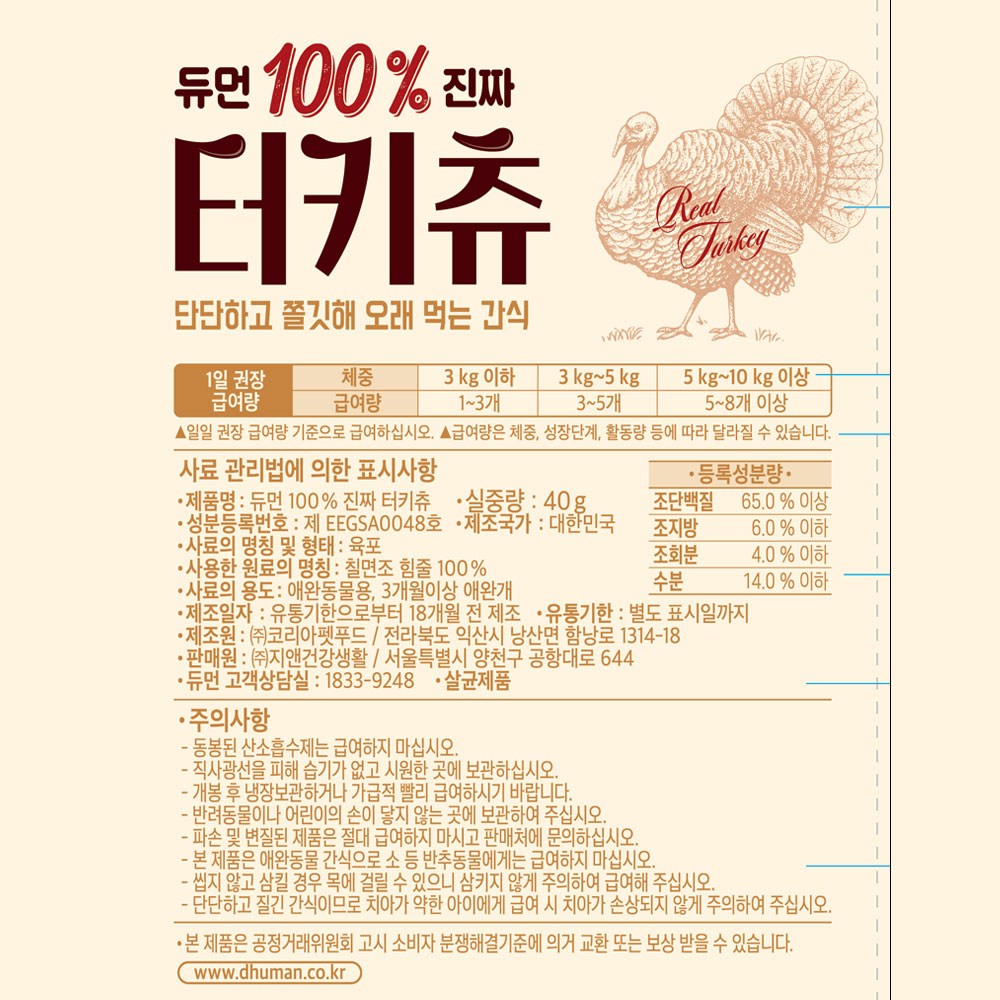 | 품명 및 모델명 | 듀먼 100% 진짜 터키츄 | 인증/허가 사항 | 사료관리법에 따른 성분등록번호 : 컨텐츠 참조 |