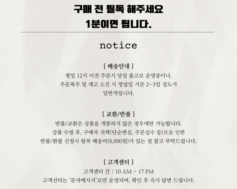 | 교환/반품 비용 (왕복비용) | 8,000원 - 단, 고객 변심의 경우에만 발생 - 도서산간 지역 배송불가 |