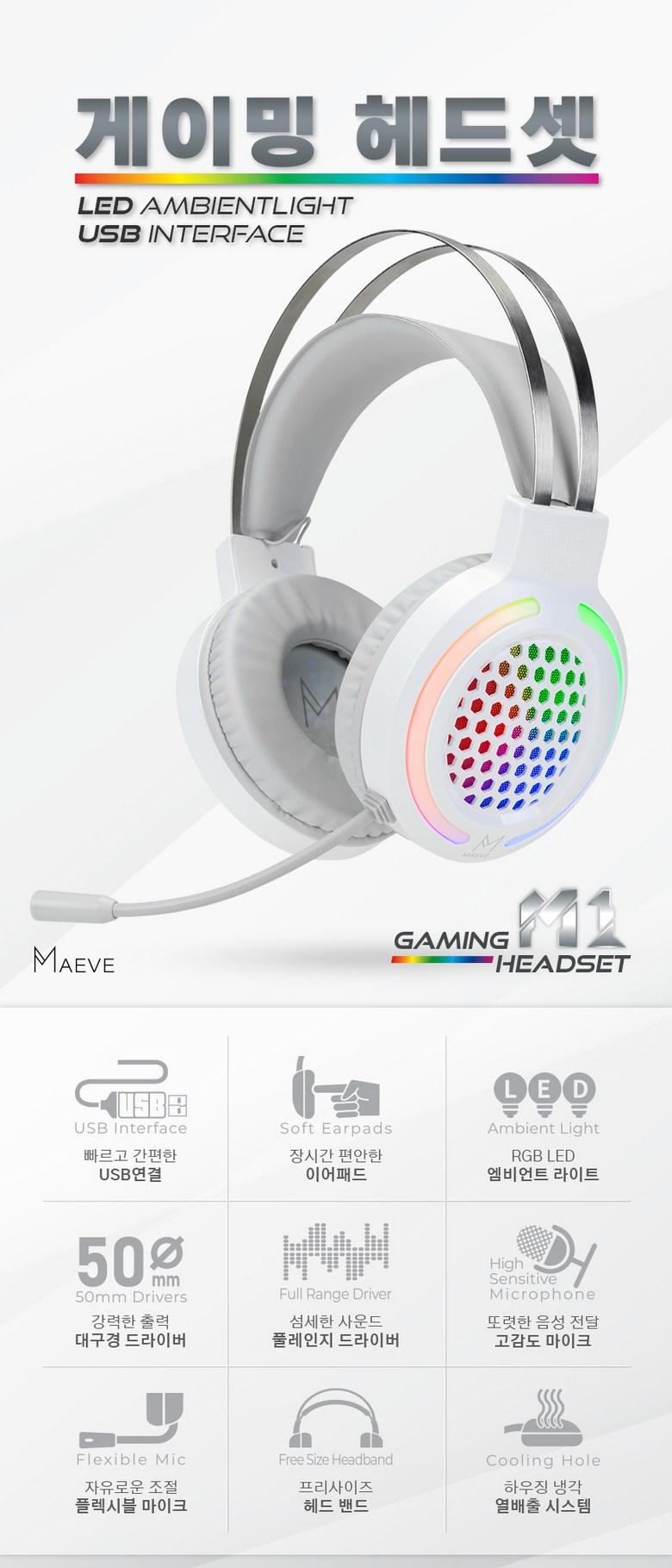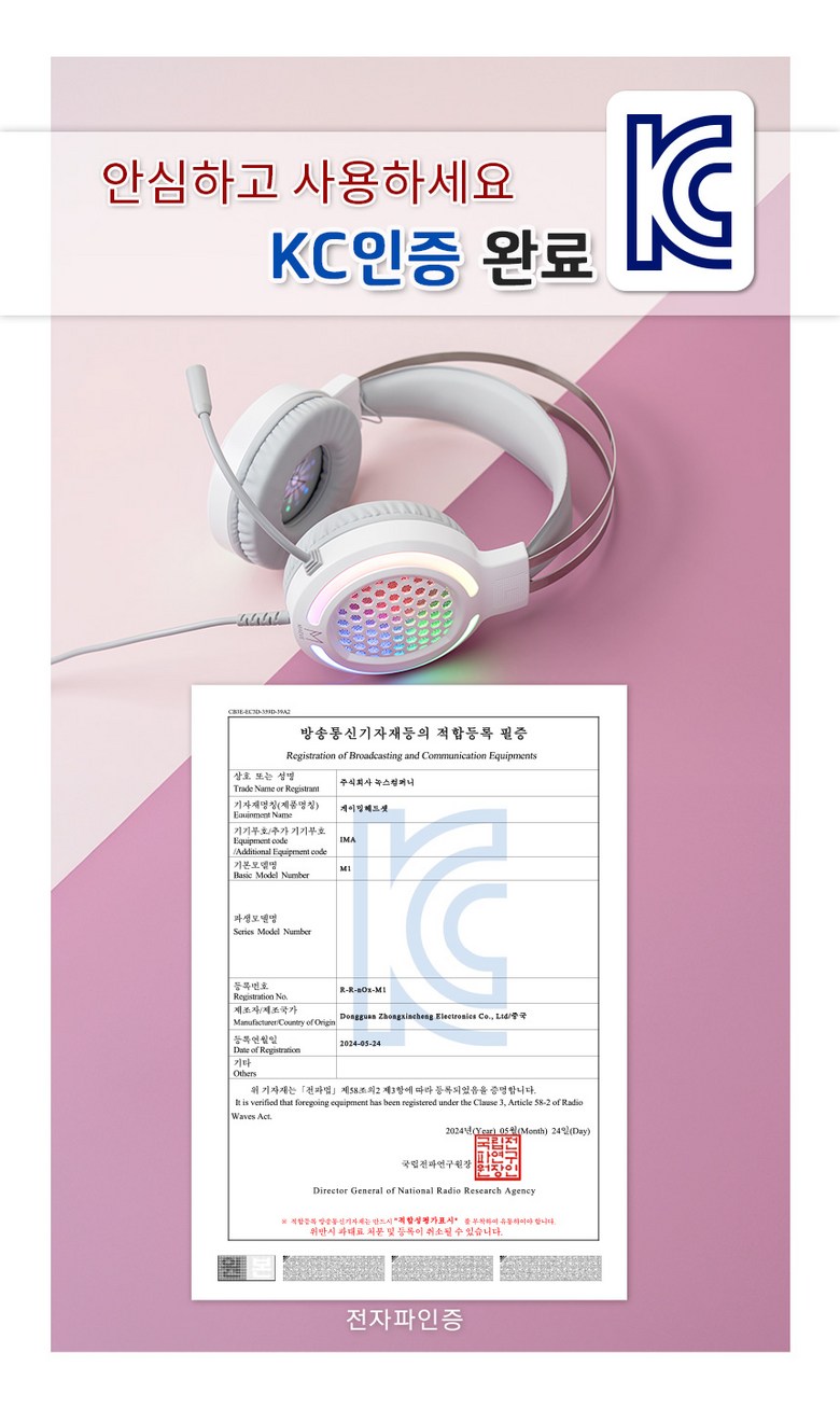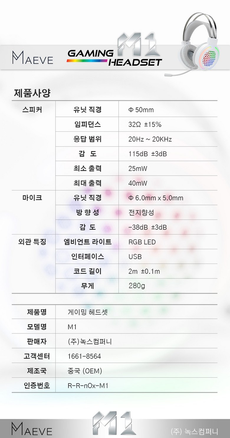 | 품명 및 모델명 | 메이브 초경량 게이밍헤드셋 USB 마이크 LED M1 | KC 인증정보 | R-R-nOx-M1 |