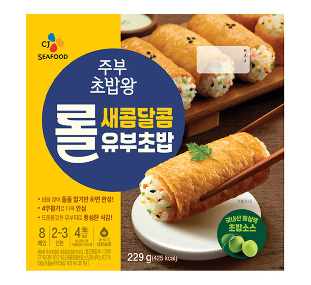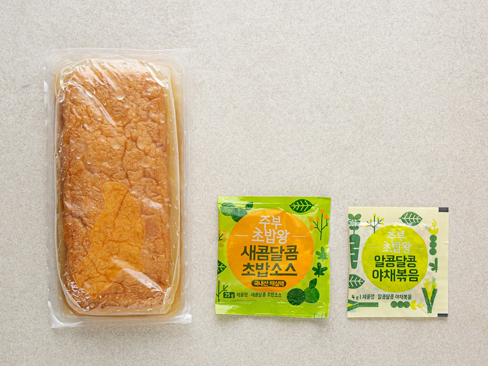 롤조미유부, 새콤달콤 초밥소스, 알콩달콩 야채볶음으로 구성되어 있습니다.