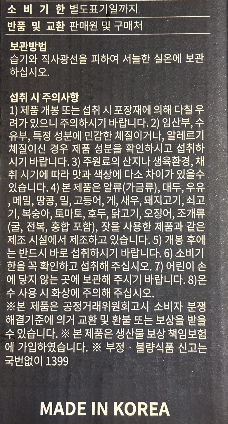 | 생산자 및 소재지 | 상품 상세페이지 참조 | 제조연월일, 소비기한 또는 품질유지기한 | 상품 상세페이지 참조 |