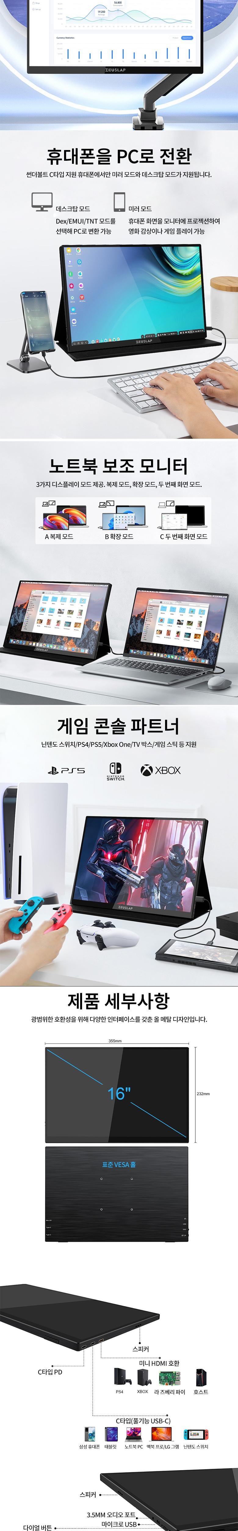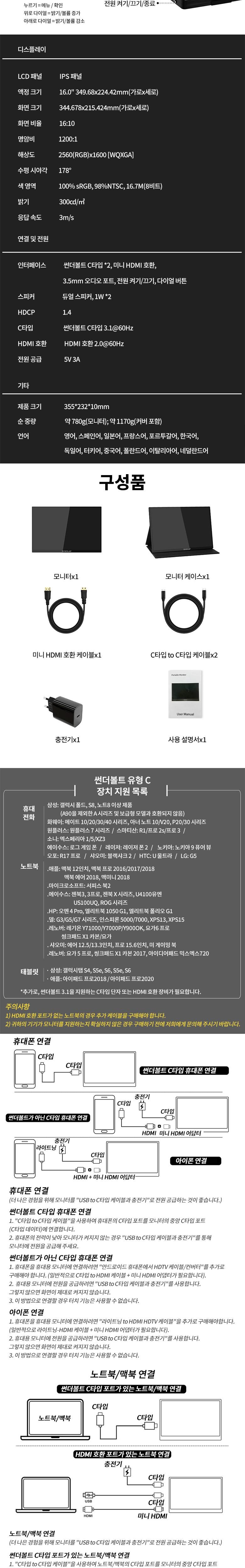 썬더볼트 C타입 휴대폰 MHL 기능을 지원합니다(삼성 S8 시리즈, 화웨이 메이트 시리즈, P30 시리즈, 스마티잔, 원플러스 7플러스 등). 썬더볼트 C타입 연결을 지원합니다 (닌텐도 스위치, 맥북 프로, 아이맥 등). HDMI와 호환 연결(PS4/PS5/Xbox/TV박스/디지털 카메라/PC/노트북 등) 가능 합니다. 16인치, 2560*1600 해상도, C타입 144Hz과 HDMI 120Hz, 16.7M (8비트), sRGB, 76% NTSC 입니다. 밝기는 500cd/m², 화면 비율은 16:10, 명암비 기본값은 1200:1" 입니다.